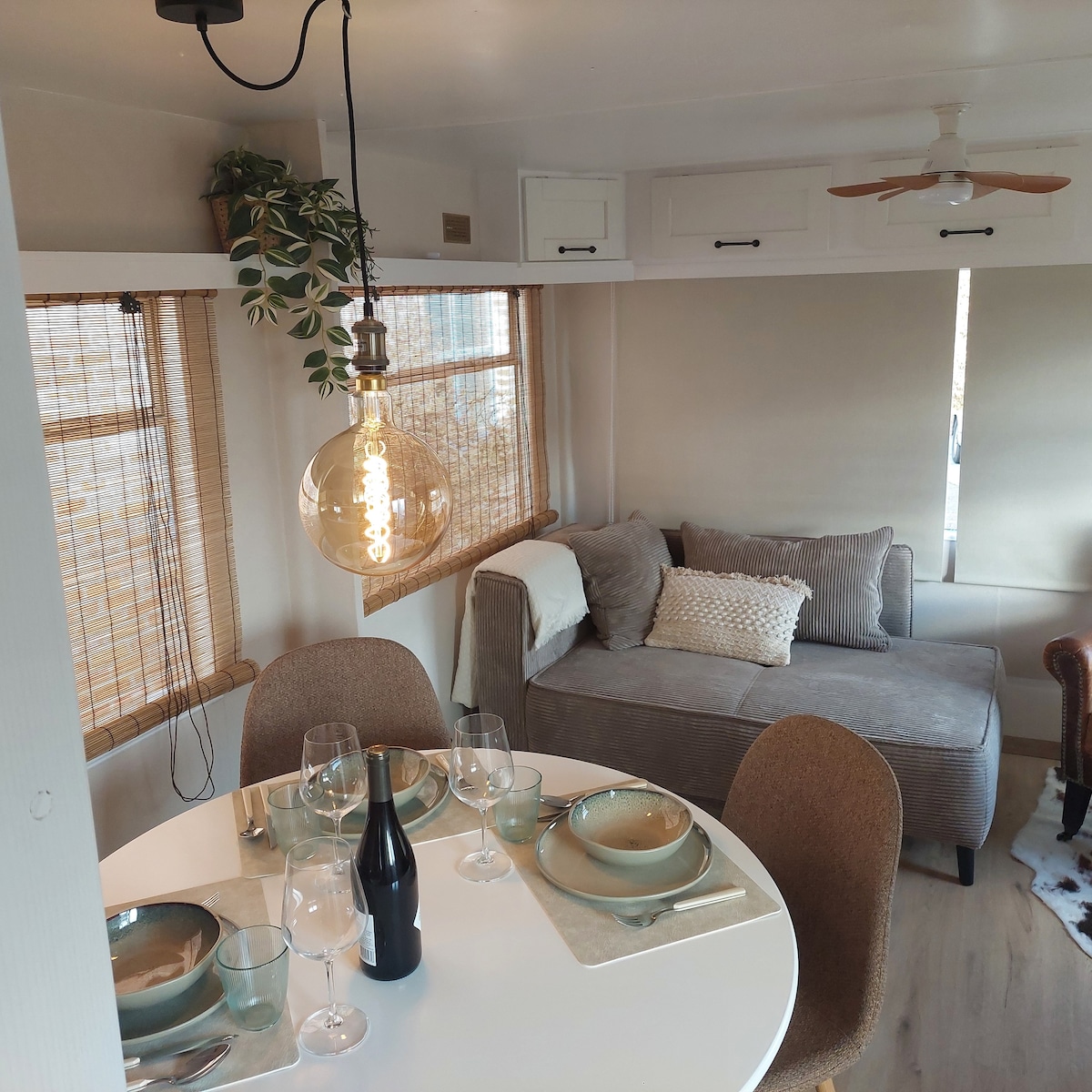 Dame Jeanne is a place to stay with a soul. The atmosphere is determined by the character of Dame Jeanne bottles in and around the cottage. The accommodation is a spacious caravan with plenty of natural light, as if nature is subtly coming in. It is a unique place for cyclists, hikers and city trippers. Charging points for bicycles are provided. This location is suitable for 3 people. Be inspired by the charm of "De Dames" and feel at home in the cozy cottage.