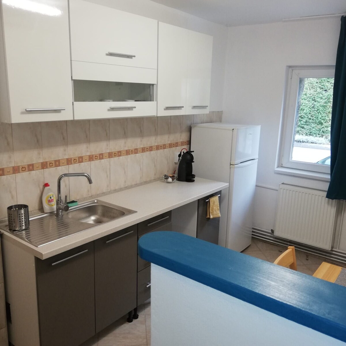 The fully equipped, very bright apartment is located in a 10 minutes walking distance from the city center. Many storesand a farmers market are just 3 minutes away. The bedroom has a double bed (160 x 200) and fits 2 people and an infant, too. In the living room you can find an expandable sofa bed for one/two persons, a dining space and a working desk. Fast and free Wi-Fi available. The apartment is located on the second floor of a condo, in a safe and quiet area.