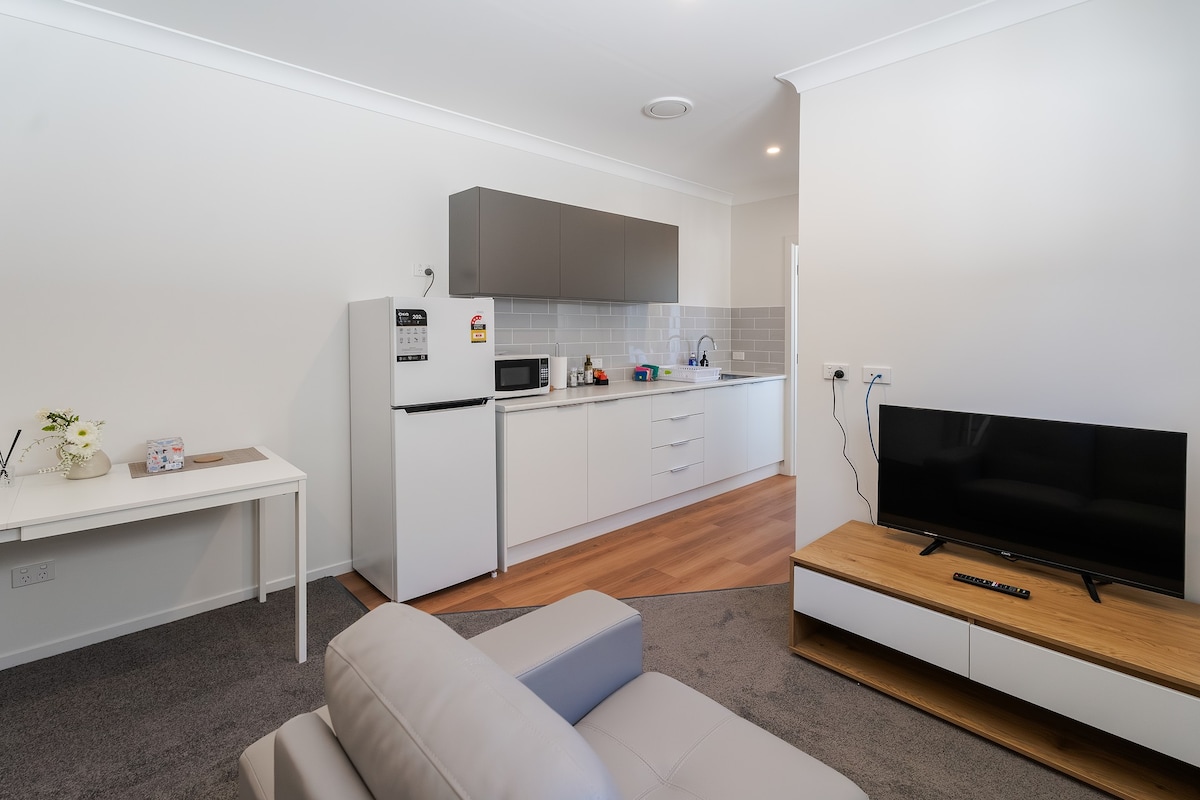 The Little Scandi Studio is modern, bright and clean. A little bit of Luxury and privacy in the suburbs. The Little Scandi Studio is one room 14.2sqm there is a large Queen bed a fully equipped kitchenette and modern bright separate bathroom. The Little Scandi Studio has a small outdoor deck a BBQ with table and 2 chairs contained in a secure courtyard. Which also has a washing machine.