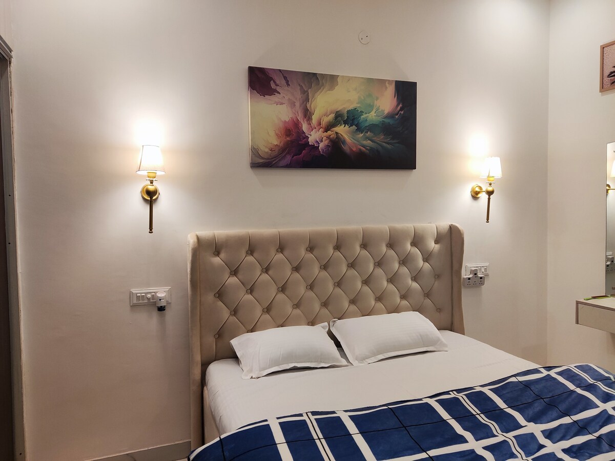 The fully furnished studio appartment, designed sophisticated and beautiful. it's a very spacious 380 sq.ft, luxury room, with full of positive vibes. Also guest will enjoy their full privacy, peace and comfort, as it's a separate unit/flat without any interference. ENTRY:- Self chk-in entry access, through Hi-tech digital security lock, as it's a owner free property.