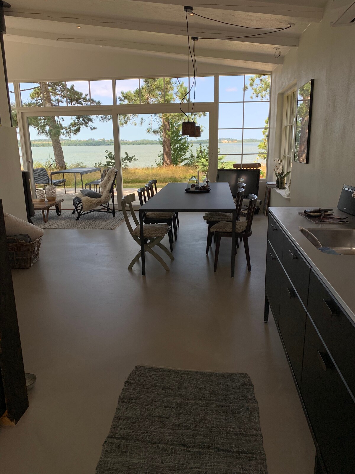 Beautiful modern cottage in the first row with magnificent views of Roskilde Fjord. High up on a hill where the fjord view all day long and the sunset is most beautiful. The house is 98 sqm and stylishly furnished with a living/dining room from which there is a clear view of the fjord. The living room has a built-in fireplace and the house contains four cosy bedrooms, a functional bathroom and separate well-equipped kitchen. From the wooden terrace there is a stair leading directly to the beach.