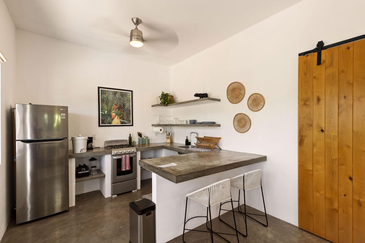 Nature meets modern in this newly remodeled casita just a few minutes away from the beach, so close you can actually hear the ocean! This fully-furnished home has everything you might need for a perfect stay in Todos Santos. The garden is nothing short of spectacular! Lush greenery, tropical fruit trees and fresh herbs, hammocks, and plenty of space to enjoy the crisp air of this town make this location the ideal vacation home.
