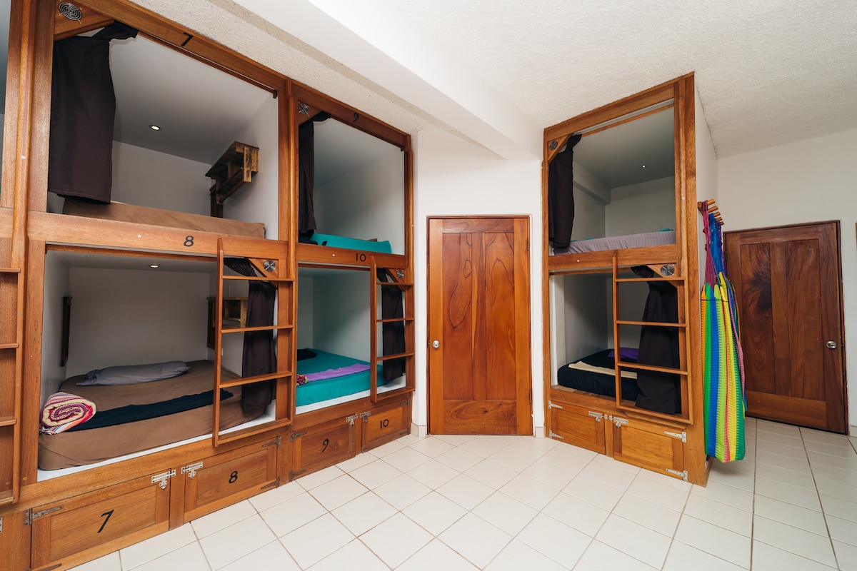 12 individual hardwood sleeping pods in the main dorm of a small compound in Punta Gorda, Toledo District. Each pod is numbered with a privacy curtain, shelf, and locker. AC, shared bathrooms. You'll share the courtyard, rooftop sundeck, and common areas with other travelers. No meals. Walking distance from local restaurants.