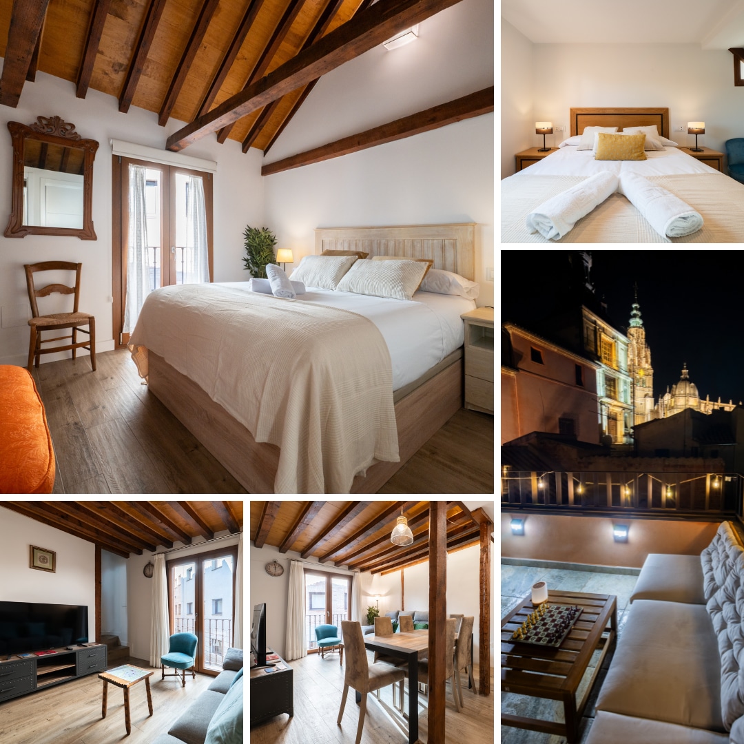 Discover the charm of Toledo from this newly renovated apartment in the heart of the historic center. It has a private penthouse with panoramic views of the old city, highlighting the Cathedral and the Alcazar. Unique apartment with spectacular views of the old town of Toledo. Alcázar de Toledo – 4 min walk Toledo Cathedral – 5 minute walk Zocodover – 6 min walk