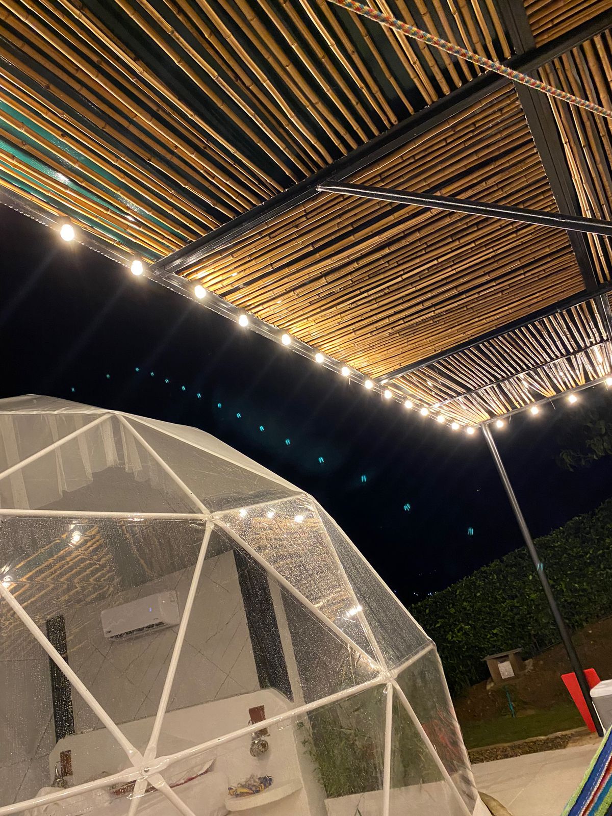 Eco dome made of recycled material, geodesic shape, with glass sections that allow you to enjoy the coffee cultural landscape and glass roof to see the stars from the comfort of your bed. You can also relax in a private Jacuzzi with 120 hydromassage jets, next to your partner and enjoy the warmth of a campfire in the middle of nature.