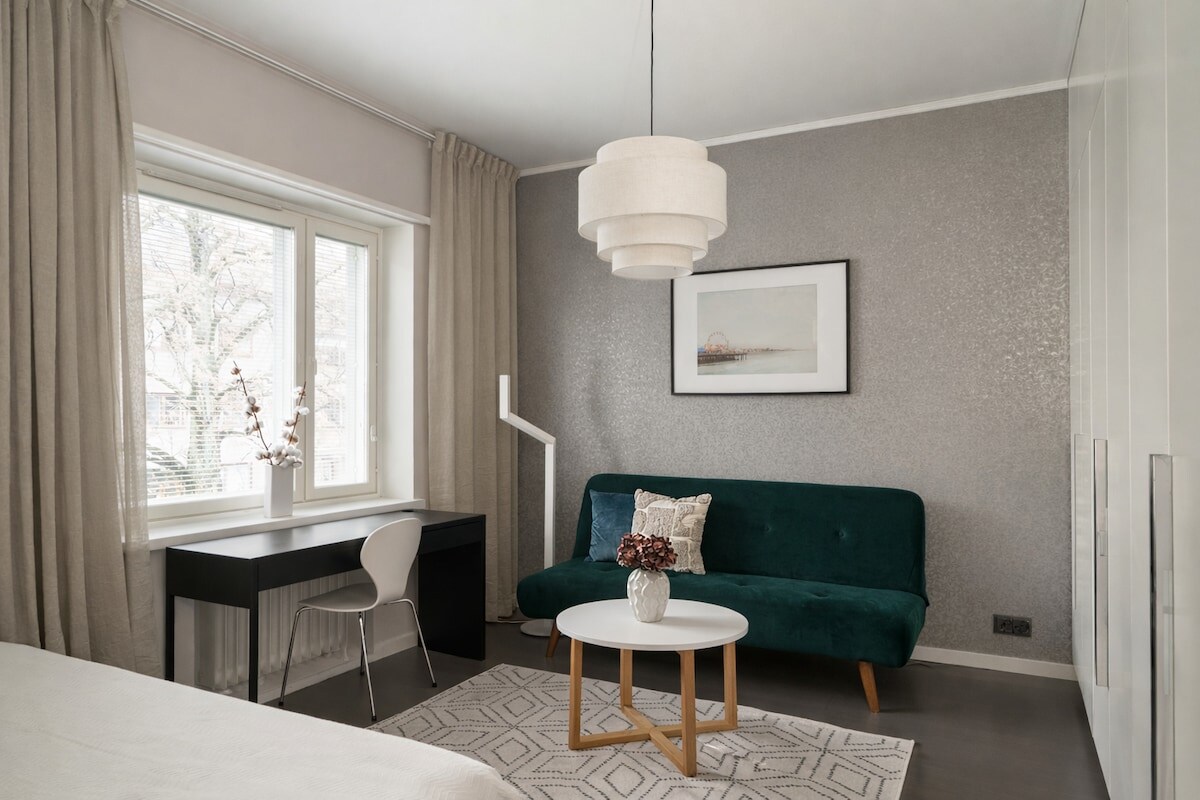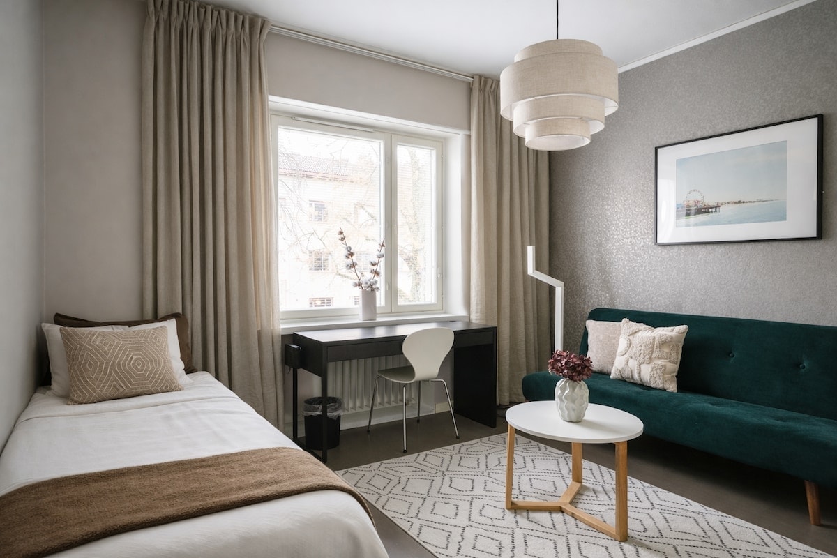 This furnished spacious studio apartment comes with warm colors and a fully equipped open layout kitchen. This studio is well suited for short and long term stays with a spacious layout, large Jugend-style windows, and plenty of closet space. Get the practical things like a fully equipped kitchen, washing machine, fast WiFi, 24/7 support, and regular professional cleaning, and fun stuff like a smart TV. Stay in comfort for as long as you’d like – days, weeks or months.