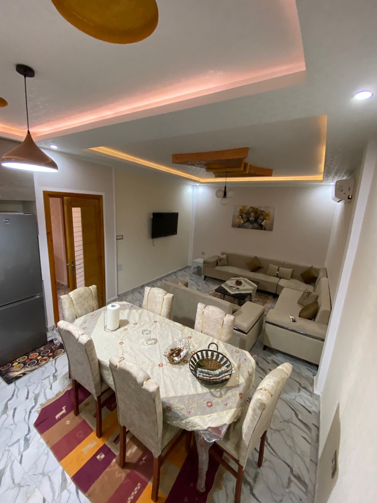 The property is a new building, and is located less than one kilometer from the center. The apartment has 3 rooms, a large living room, a fully equipped kitchen, a bathroom with a washing machine, 2 terraces. Up to 10 people can stay there. A grocery store is located right next to the accomodation. The city of Tozeur offers a lot of entertainment.
