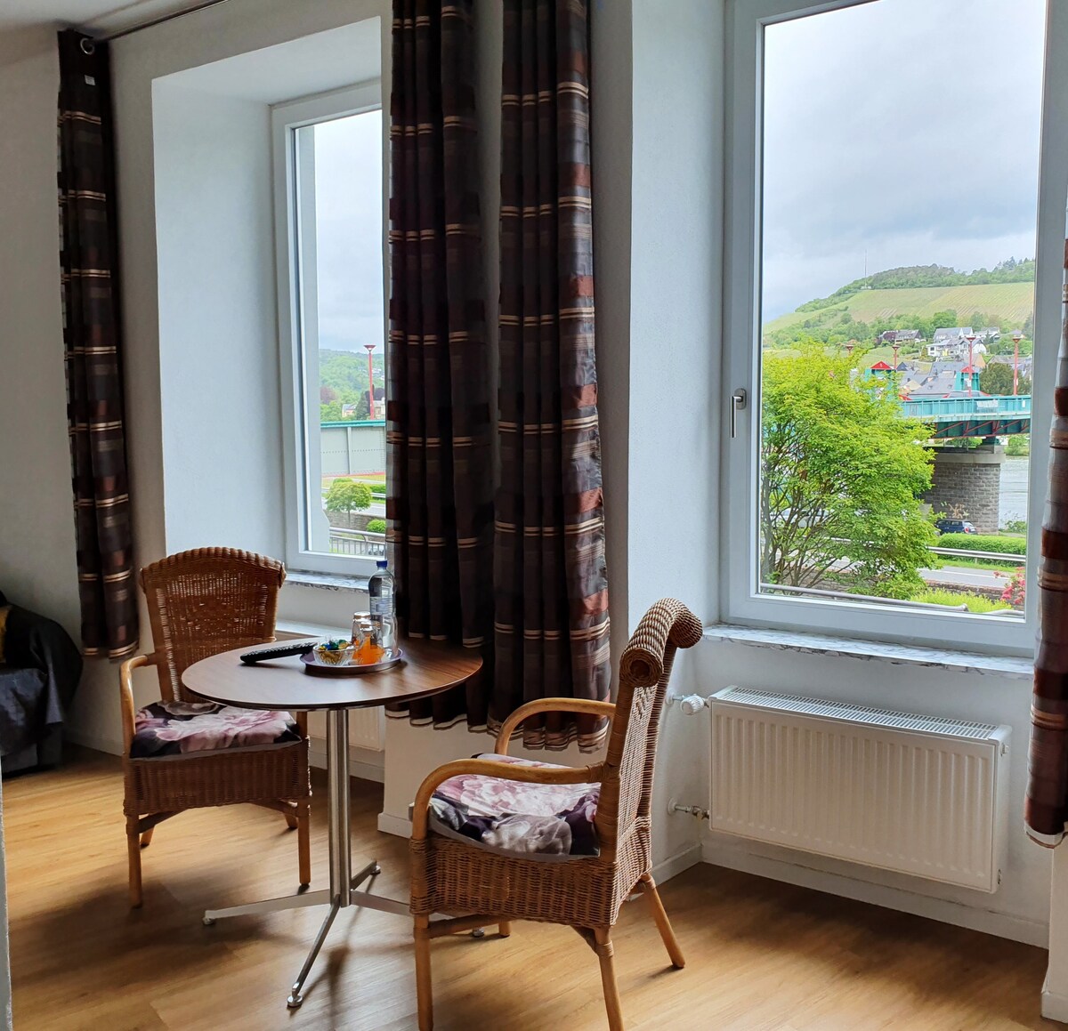Apartment MOSELO in Traben-Trarbach, directly at the bridge gate with a view of the Moselle promenade in Traben, especially beautiful at night, ideally located directly on the pedestrian zone, where there are restaurants, cafes and shops that invite you to shop and eat From April to Oktober we offer a Varieté Circus Show in our house in the backyard. Tickets can be booked on our website Moselpalast Varieté