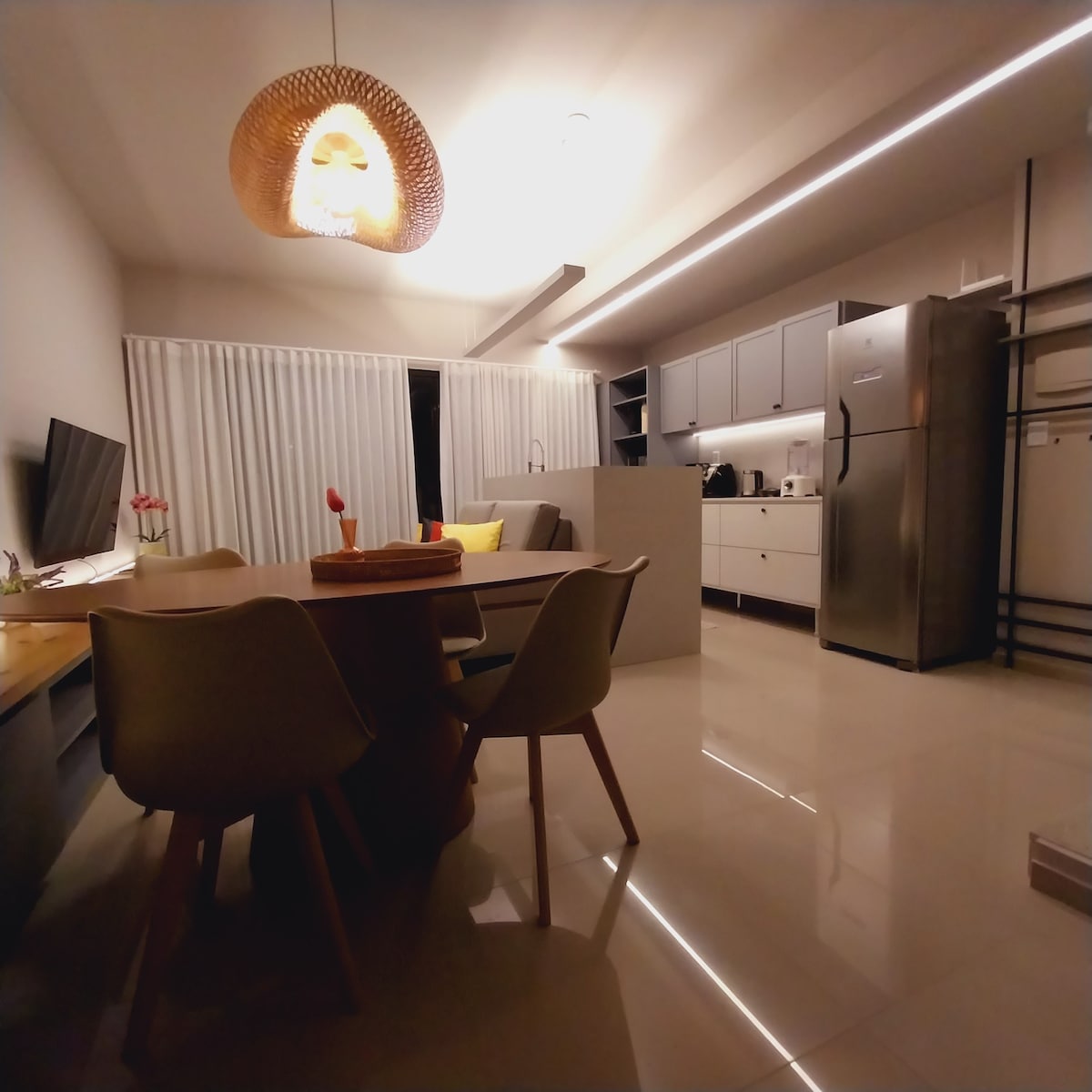 Novo decorado, sob medida, dois dormitórios, um de casal c/ TV, um de solt. c/2 camas, uma auxiliar e um pufe cama.Os dois quartos c/ mesa para note. Um banheiro c/ todos itens, incluindo secador de cabelo. Cozinha c/ microondas, forno elétrico, suggar, cooktop, geladeira,torradeira, air fryer, ferro elétrico e água filtrada. Água quente, lava e seca, sala de estar c/ sofá cama, integrado c/ sala de jantar, cozinha e churrasqueira. Todo climatizado, orientação solar ótima e telas nas janelas.