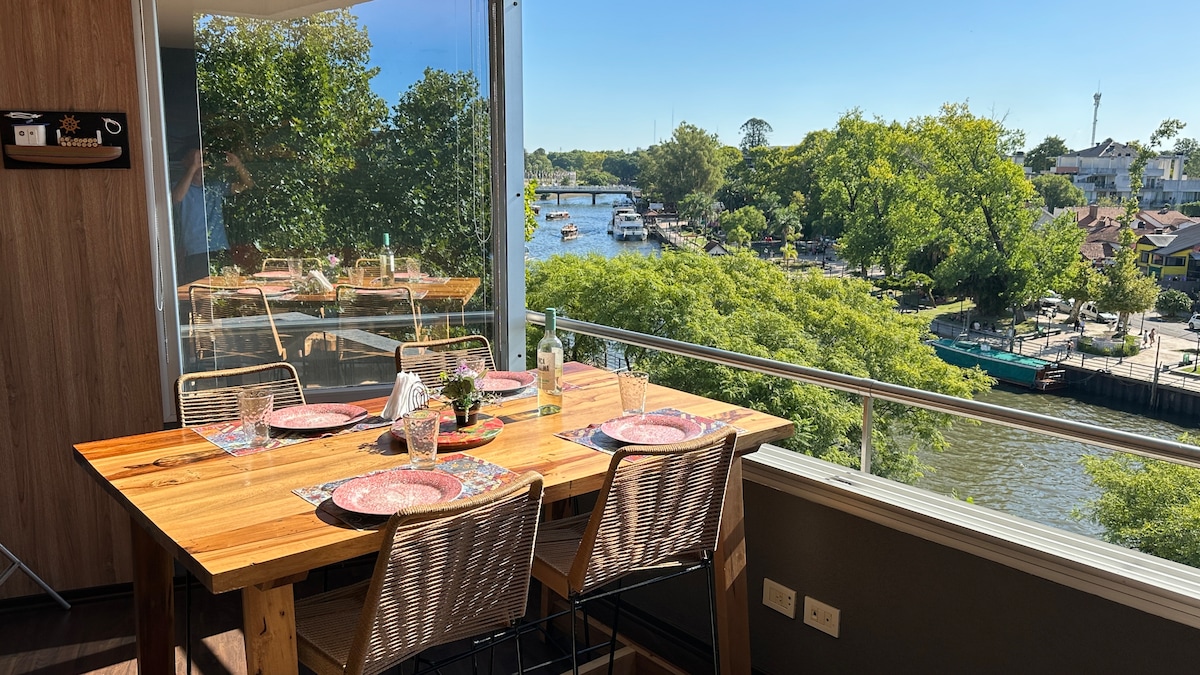 Uno de los mejores departamentos en el corazón de Tigre frente al río.Cerca del Puerto de Frutos, estación de trenes, Parque de la Costa, restaurants y de la estación pluvial. Parrilla en la terraza y estacionamiento en el mismo predio. Te imaginas desayunar, almorzar o cenar en una mesa de madera de guayubira mientras disfrutas de una vista privilegiada al rio? Bueno eso es posible las 24 horas. Con el mejor equipamiento y rodeado de las mejores vistas y coloridos atardeceres.