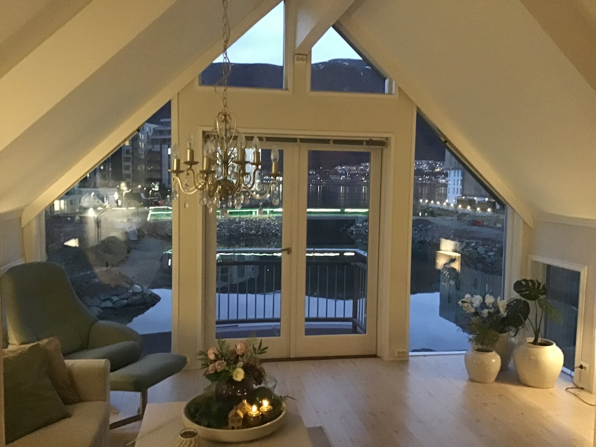 Sentrumsnær leilighet i vannkanten. 14 minutters gange til kjernen av byens restauranter og kjøpesenter. Leiligheten er varm og komfortabel, med første rads utsikt over havet, fjellheisen og Tromsøbrua. Gode bussforbindelser og matbutikker i nærheten. Kjøkkenet har det du trenger for å tilberede og nyte måltider hjemme. Oppreide senger og håndklær. To garderobeskap. Her kan du slappe av og samtidig nyte utsikten av landskapet, når du ikke er ute å utforsker det spennende arktiske Tromsø.