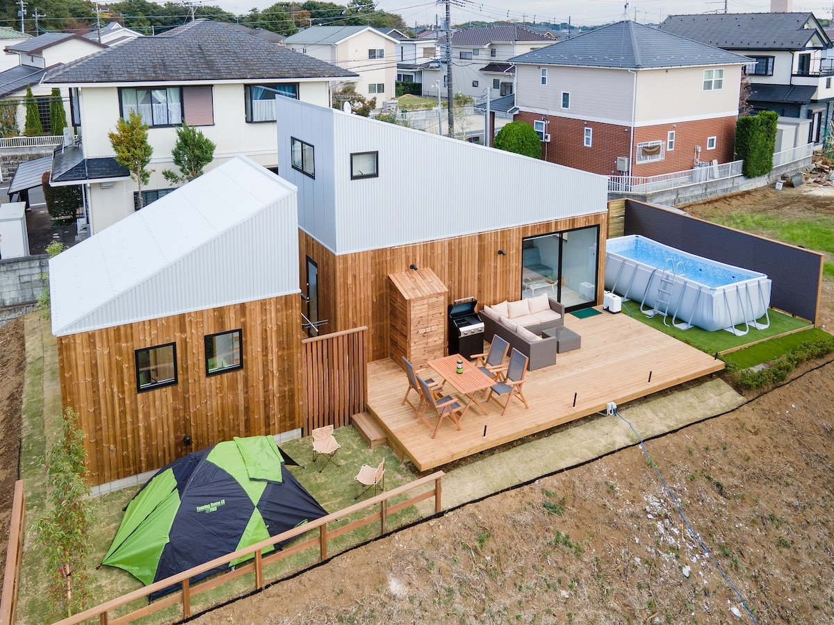 In a small space, there is an infinitely luxurious time. This is a proposal with the wish of "spending time like this" because of the coronavirus disaster. Building A "Secret Base for Adults and Children" It has a high ceiling and a 6-jo loft, kitchen, toilet, and shower booth that can accommodate up to 3 adults. It is truly a secret base for adults and children. Packed with excitement! ● View from the large deck. We also have a BBQ set. ● Mountain hut atmosphere in the loft ● Large pool * Summer only (March-November) ● Watch movies and sports with a projector and wide screen ● Tents can also be set up outdoors. Building B "A man's playful spirit-filled bike garage" ● Bike room ● Sauna room for up to 2 people ● Sleep in the loft ● Outdoor jacuzzi "Mirabus" to relieve sweat and fatigue
