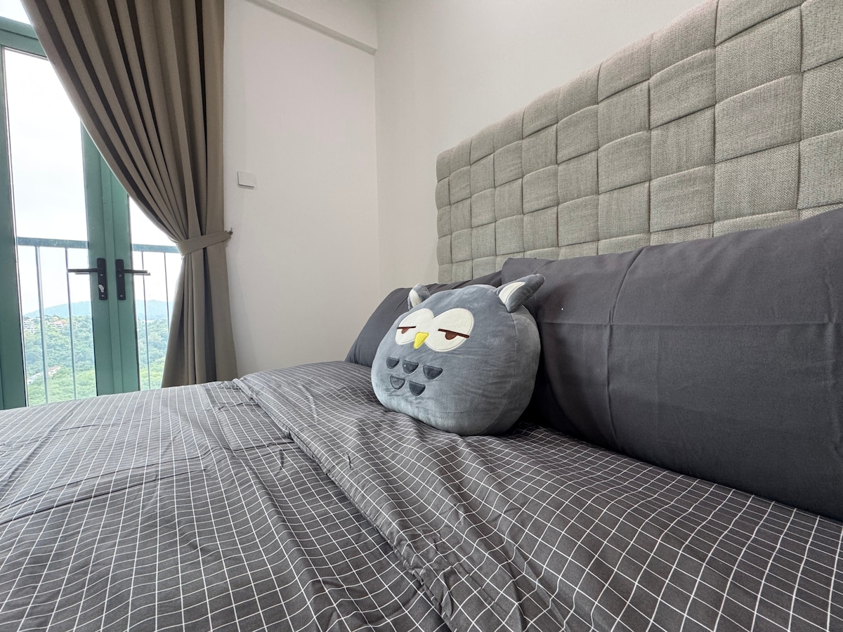 Stunning Sea view from the house. Chilling at the balcony. Swimming pool@level 6 Living Room, Queen Size bedroom, private sofa bed corner with curtains. Ensuite bathroom with hot and cold water shower. Large refrigerator with ice cube , mini kitchen with electric cooker, pot,plate,spoon,fork are available . Light cook at the kitchen. Filter water machine hot and warm. Please select 3 guest if you need single bed setting convert from sofa bed.