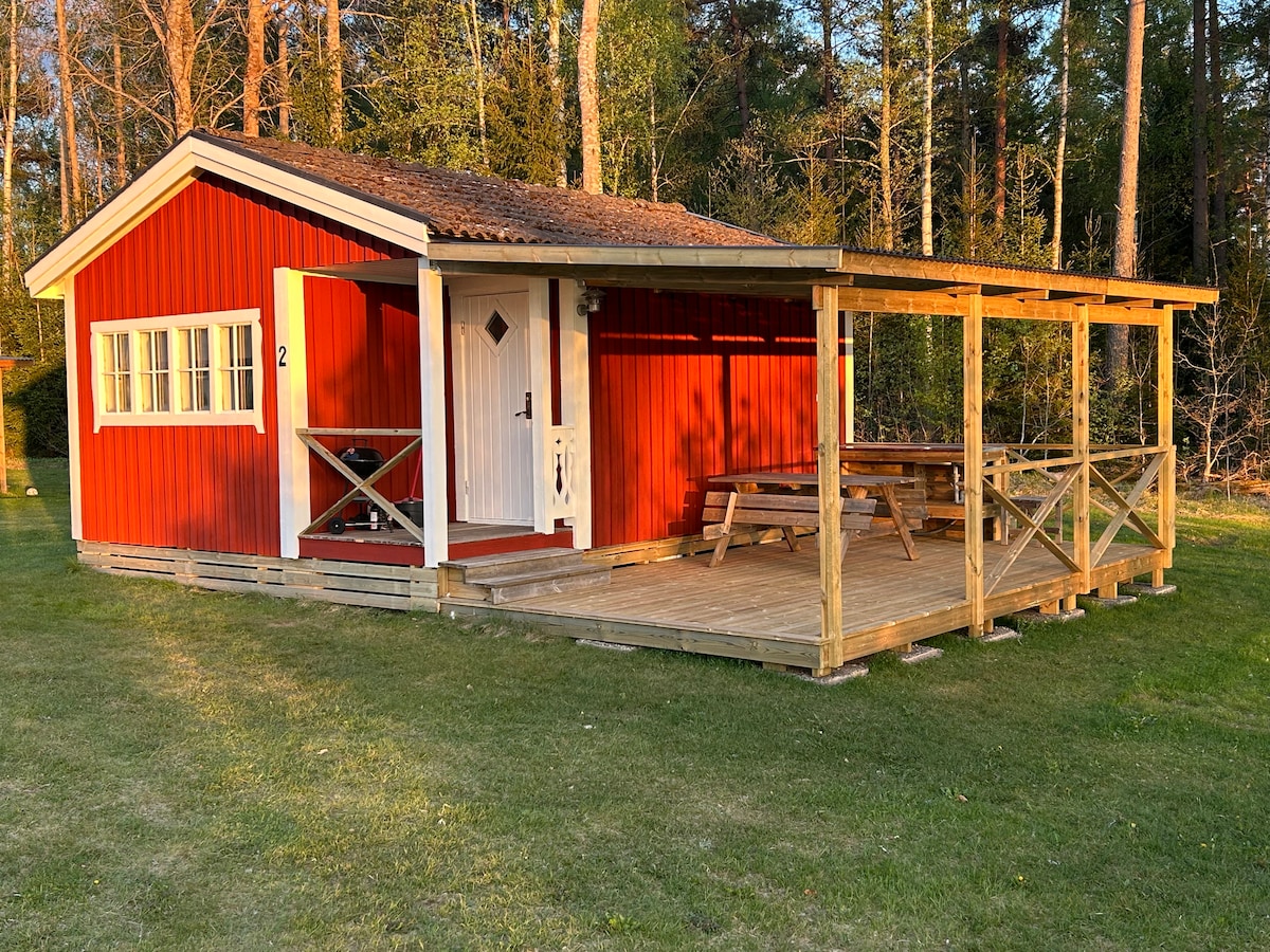 A tasteful cottage with double bed in a sleeping room and up to five madrases on a spacious loft. Sauna and veranda, BBQ, garden furniture, playground. Nice, quiet life at the countryside. Trampoline, lots of playgames and books. A great place for children! 200 m to bathing place with boat. This house is situated close to my own house, we will be neighbors during your stay. You are welcome! 25 minutes to Astrid Lindgrens World. Guidebooks on the surroundings are available at Basebo förlag.