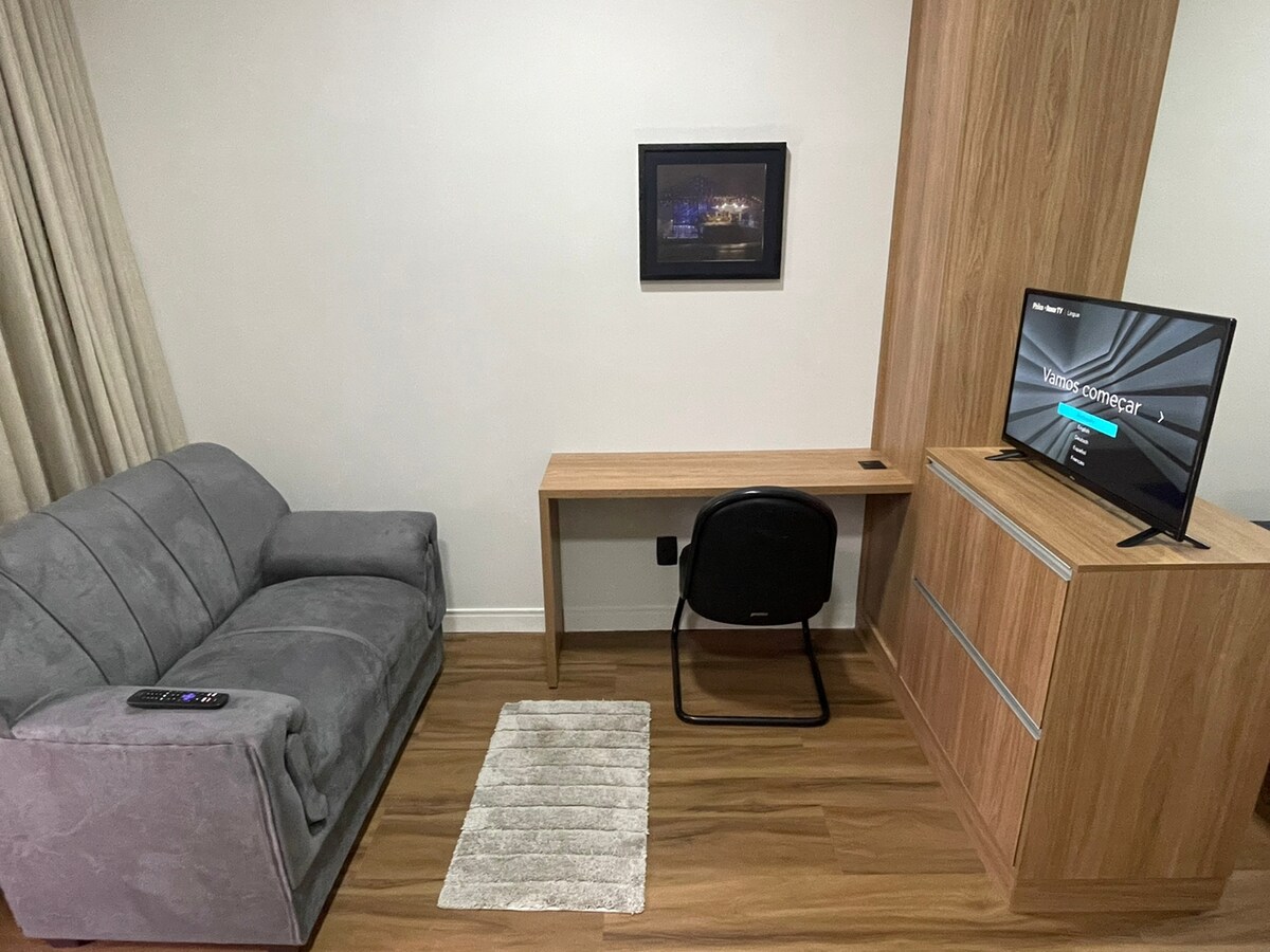 Um local pequeno mas agradável e limpo. É um quarto conjugado com uma cozinha e um banheiro. No quarto tem uma cama de casal e um armário na cozinha tem mesa com 4 cadeiras , geladeira, fogão armário e eletrodomésticos. Tenho tudo o que precisa para um casal ou até 3 pessoas, podemos colocar um colchão extra! Não é apropriado para longas estadias, pois não tem área de serviço nem quintal. Fica no térreo.