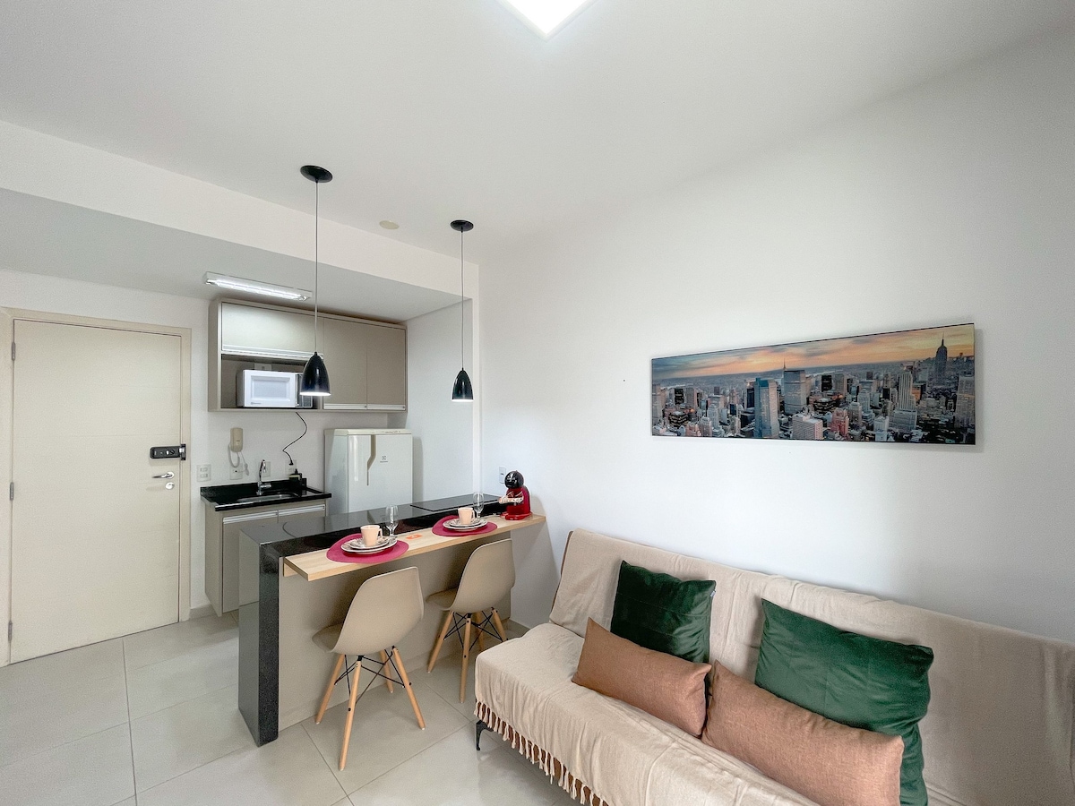 Brand new and sophisticated apartment, ideal for rest or work. Suite with spring bed, modern lighting, desk, large closets and 2 bathrooms with a differentiated shower. The single room has 2 single beds, a wardrobe and a desk. The living room is spacious, decorated, with a retractable sofa, plants and a smart TV. Complete kitchen and laundry with premium appliances, washer and dryer. Comfort and practicality next to Hospital de Amor