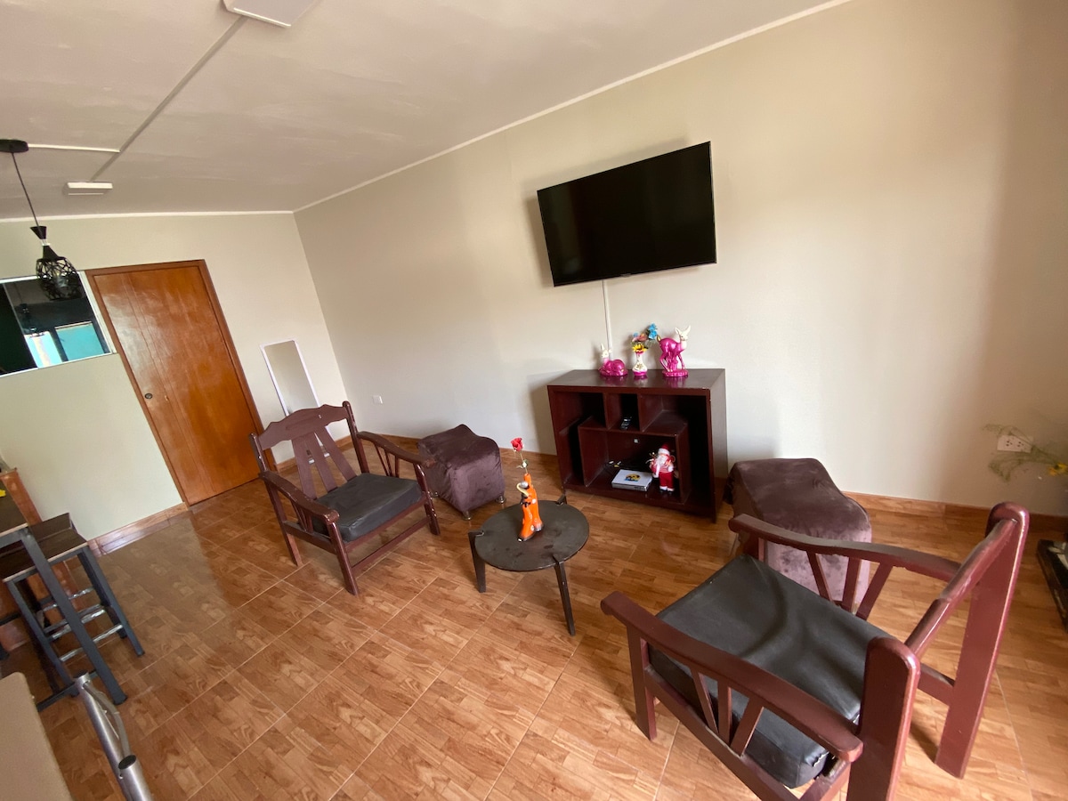 Mini-apartment located in Huarmey, minutes from the Tuquillo Spa. It has 3 beds (1 queen size bed and a cabin with 1 double bed downstairs and 1.5 beds upstairs), open kitchen, bathroom, dining room and backyard. With independent entrance and internal garage (subject to availability). The Accommodation also has other single, double and queen rooms (on request).