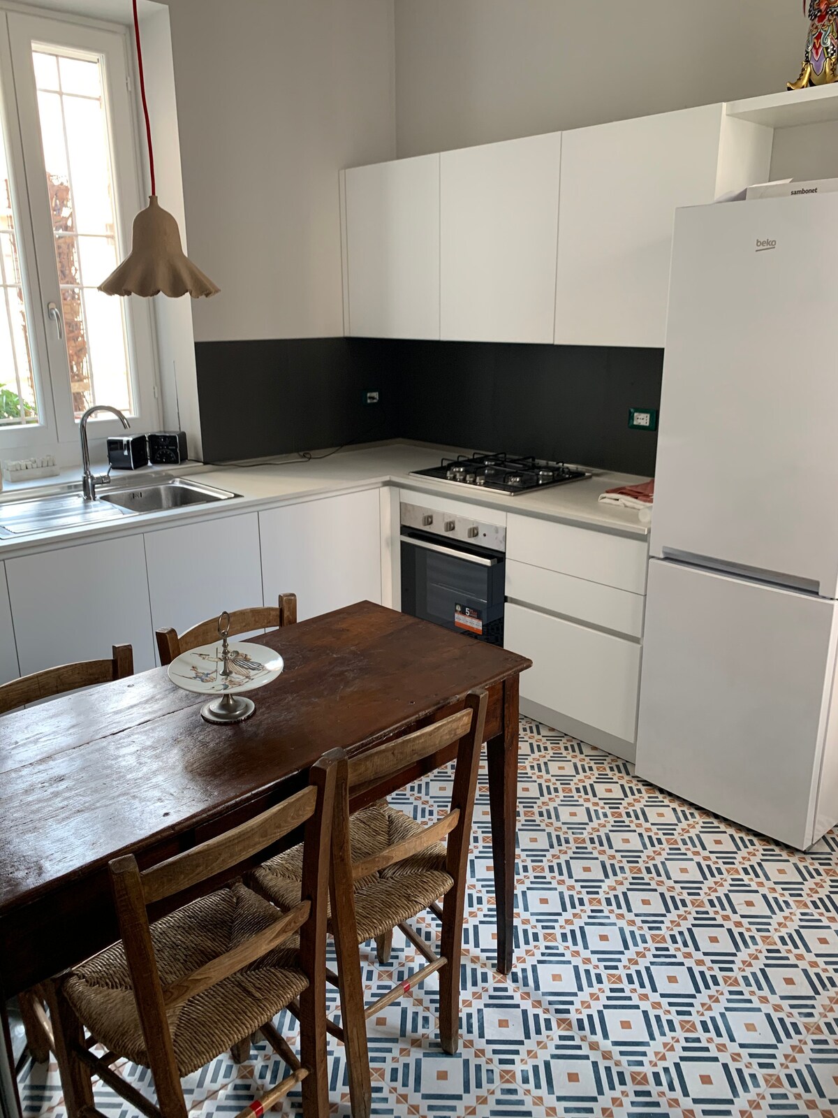 Cascinetta a short walk from the center, with free parking outside the property. Ground floor: garden, porch, equipped kitchen with very large living room/lounge/work area, bathroom. First floor: study, 1 double bedroom and a large bathroom with jacuzzi tub and double shower + 1 double bedroom, both with ceiling fans. Parquet and stone flooring, very well-kept furniture with contrasting elements between vintage and modern works by the owner artists.