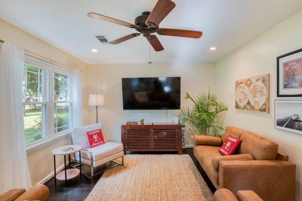 Cute updated home less than 5 miles from Denny stadium. Plenty of parking, large private fenced back yard, deck and screened porch with a TV. The home overlooks the park at the Veterans Affairs campus that has a public walking/jogging track. The track winds through to the University of Alabama's Arboretum. There is a corner store less than a half mile away. The Master has one king bed, second bedroom has one queen bed. There are two living rooms, one with a bunkbed and desk and one with a sofa