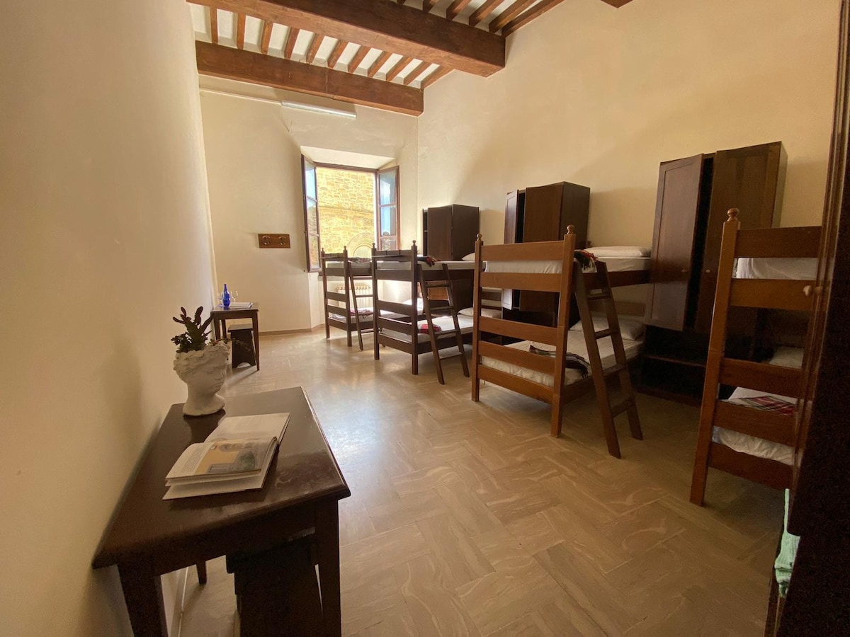 The San Marco Hostel is located in the beautiful historic center of Cortona. The shared room can accommodate 6 guests arranged in 3 bunk beds, each with linen, blankets, a lockable locker and a light. The bathrooms and showers are shared with the other rooms and are located on the same floor. Breakfasts, lunches, and dinners are available upon request. A large and charming stone lounge is available on the ground floor for socializing, studying or working.