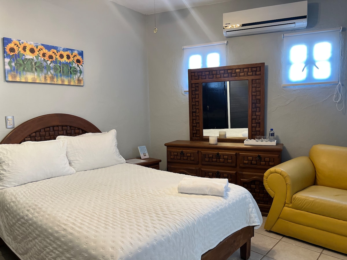 Enjoy a comfortable stay in this independent room located in a quiet and safe area of Tuxtla Gutiérrez. Ideal for rest or work trips, this space is carefully conditioned to offer you comfort, functionality, and thoughtful details for your well-being. Spacious, bright room with double bed, AC, ceiling fan, TV and work desk. It has a single sofa and full body mirror for added comfort.