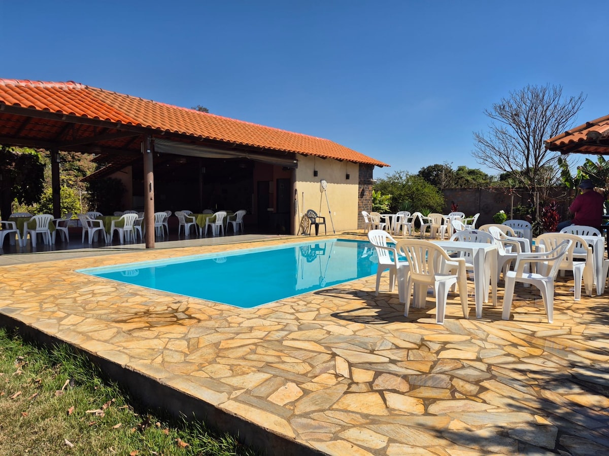 -Piscina -Ofurô -Espreguiçadeiras -Quiosque com churrasqueira, forno a lenha e cooktop -Acomoda até 10 pessoas, sendo 3 camas de casal e dois colchões de casal extra -3 quartos com camas de casal (2 com TVs de LED, 1 suíte) -2 banheiros sociais -Cozinha com geladeira, fogão, micro-ondas, liquidificador, filtro de água, panelas, pratos, talheres e copos -Sala de estar com sofá, mesa de jantar (6 pessoas) e mesa auxiliar (4 pessoas) -Ar condicionado mediante pagamento de taxa extra (50,00 dia).