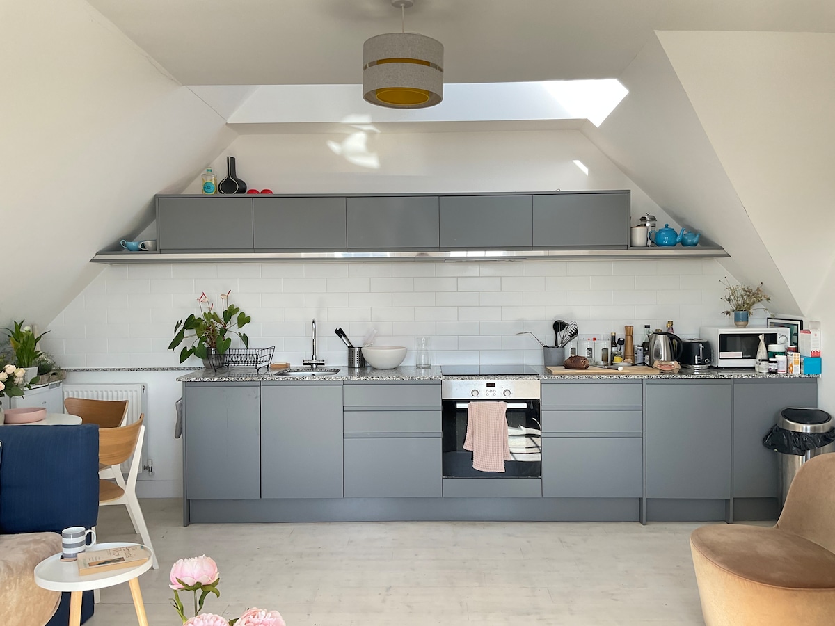 Relax in this calm, stylish space. The bright and airy living room has a vaulted ceiling and spacious lounge (including Sky TV) with separate Bedroom and Bathroom. There is a fridge and a small area for making tea / coffee and toast but no cooker - who wants to cook on holiday anyway!! There are local pubs including one within 3 mins walk serving good food, shops and even a Victorian cinema in walking distance and many other Sussex and Kent places of interest within a short drive.