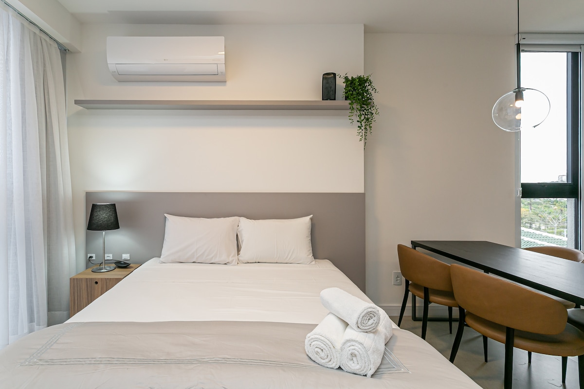 New studio, fully furnished and equipped, in a smart building with unique architecture, located just 100 meters from UFSC. Here you can forget the keys: all access is by facial recognition. Complete structure: 🚲 Bike rack 💪 Gym 👔 Coworking/meeting room 🍽 Gourmet balcony 🌿 Rooftop with lawn Live with comfort, technology and practicality in the heart of Florianópolis!