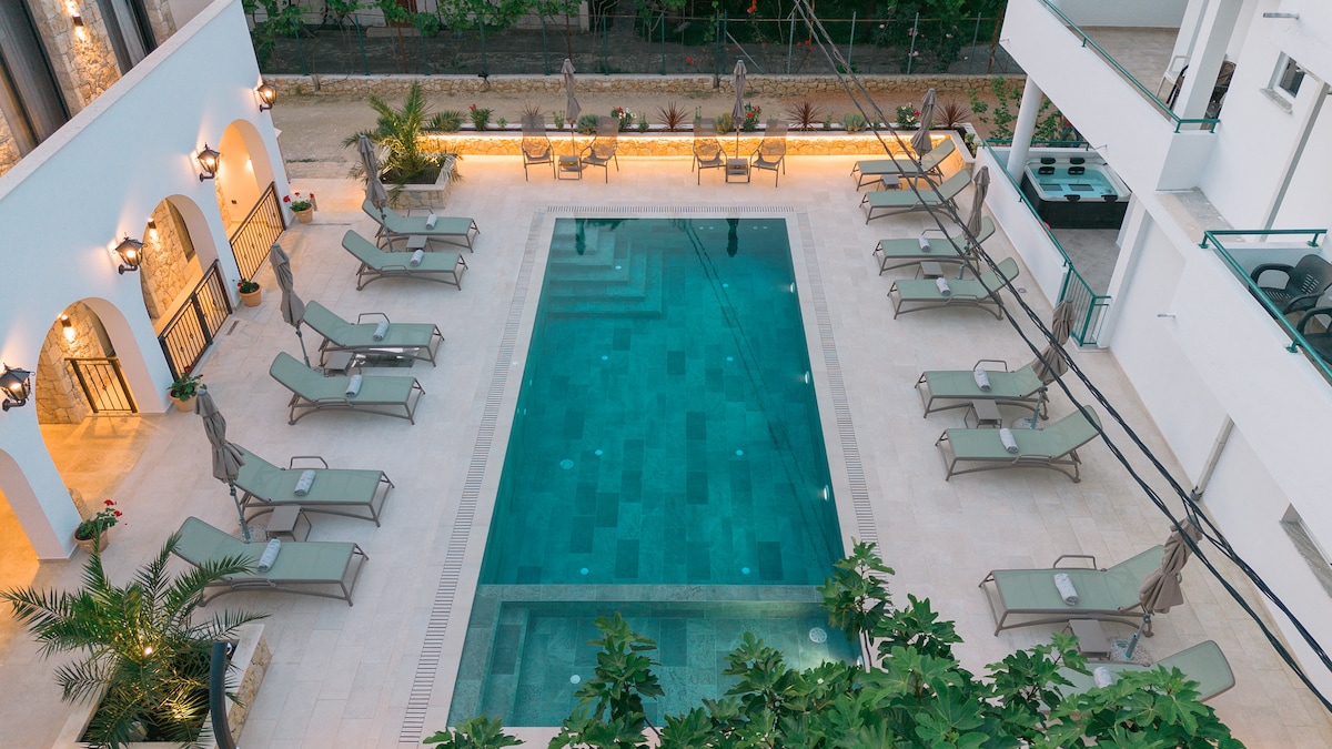 Enjoy ultimate privacy on the entire 2nd floor of our modern villa. Your large private terrace features an exclusive Jacuzzi for your use only—perfect for romantic nights or relaxing with a view of our pool. Includes 2 stylish bedrooms, a full kitchen, and premium amenities: plush robes, slippers, and hotel-quality toiletries. Located next to our famous Restaurant Lovac (est. 1928), offering top-tier local food. Your dream Mediterranean escape starts here