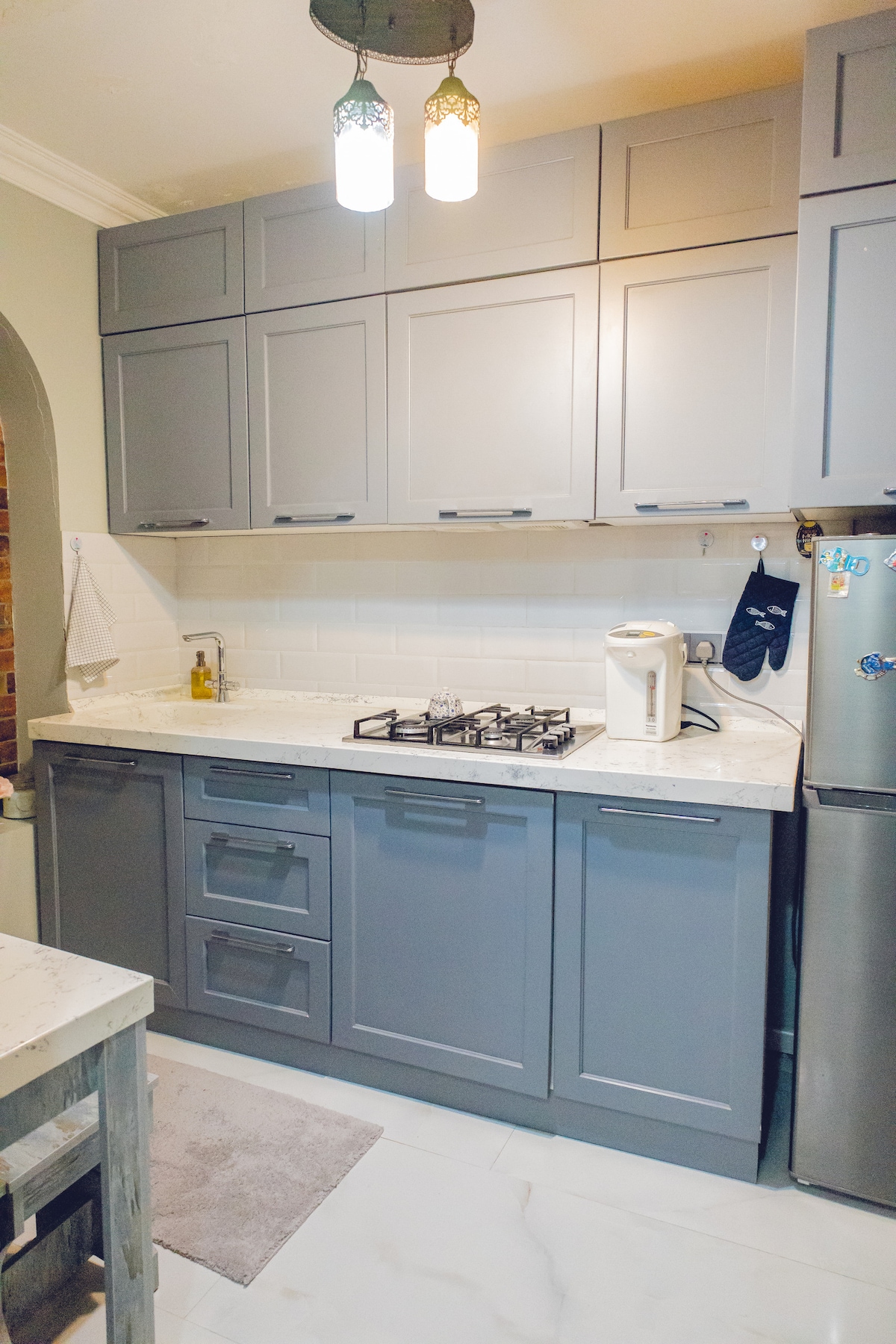 Whether you're traveling for work or as a tourist: this place has you covered. Our newly-renovated apartment was designed with comfort and practicality in mind. Soundproof walls will allow you to get a good night's rest. Heated floors will keep you warm in winter and the ACs will cool you down when it's hot outside. Those who like cooking will surely enjoy our spacious kitchen. There's a comfortable office chair and a desk for people that need to work from home. Looking forward to welcoming you!