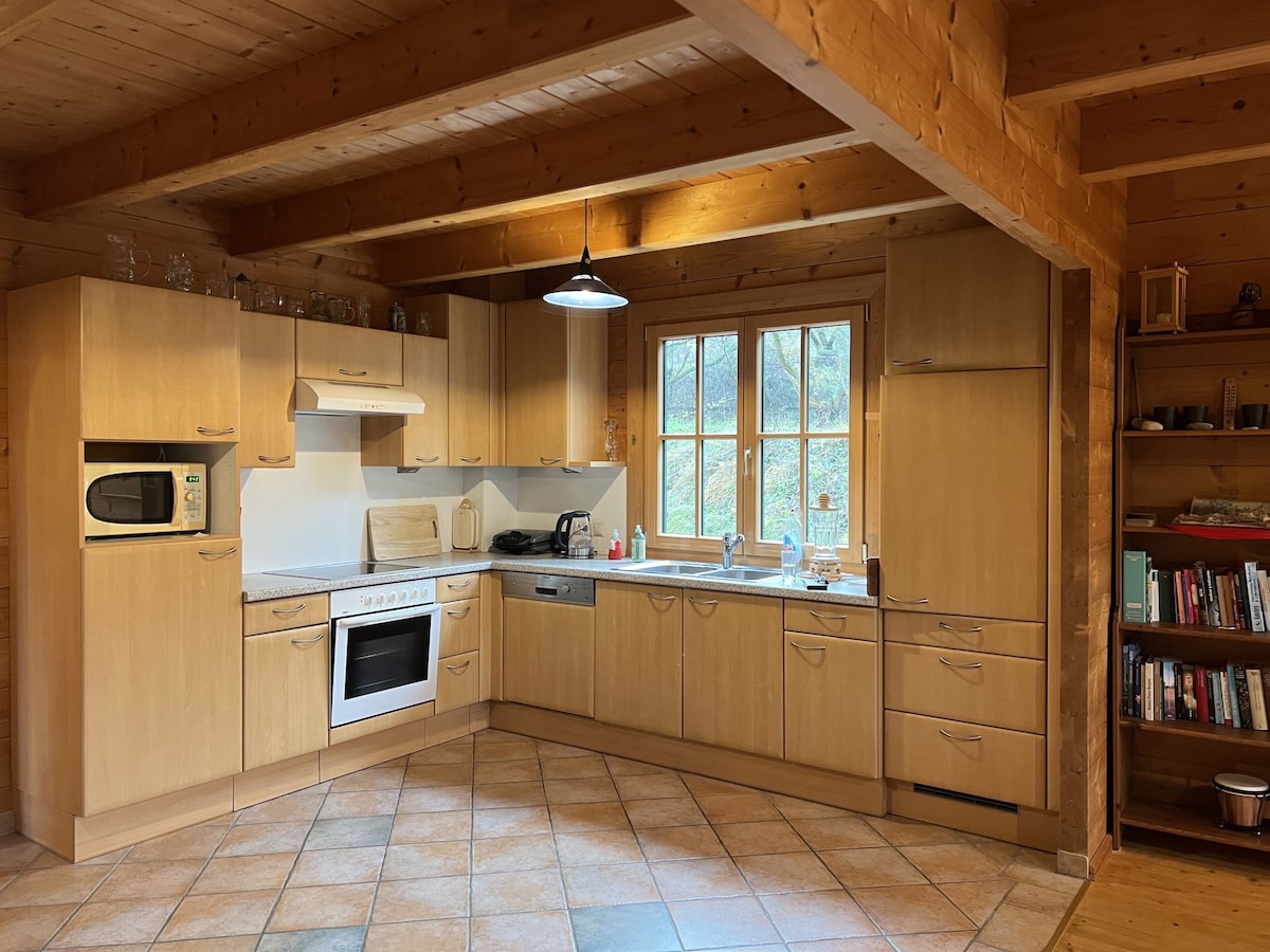 SUN HOUSE Do you and your companions like an oasis of peace to relax and/or work? Then this is the right place for you: Cozy wooden cottage by the pond, with fine sauna, about 1000 m² garden, outdoor kitchen and various grills. Bathrobe on and laptop running? Let's go! If your desired date is not available, please contact me! Price includes final cleaning, overnight stay, sauna and barbecue specials. Please pay attention to the correct number of guests.