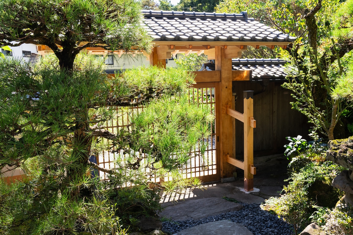 The exterior of the property displays a traditional Japanese design, framed by lush greenery and carefully arranged landscaping. A wooden entrance showcases an inviting pathway, leading to the entrance which is flanked by ornamental stones and vibrant foliage.
