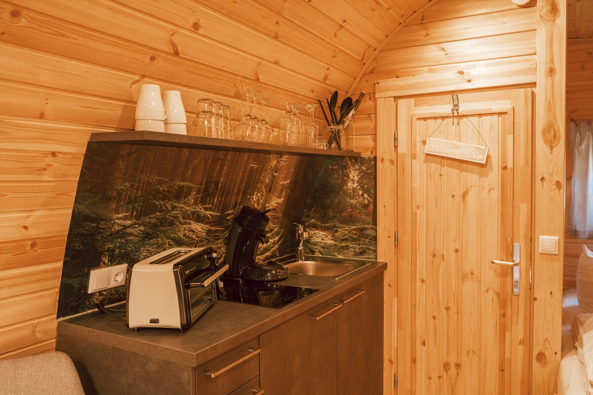 16 sqm coziness in friendly furnished bungalow for 2 people. Quiet location surrounded by greenery, adjacent to forest, meadows and fields! The kitchenette offers everything you need, as well as a sink, refrigerator, double induction stove, kettle, coffee maker and toaster. The cuddly double bed (160m x 200m) has two dimmable bedside lamps and side shelves. Sufficient storage space is provided by two shelves, the space under the bed and numerous wall hooks.