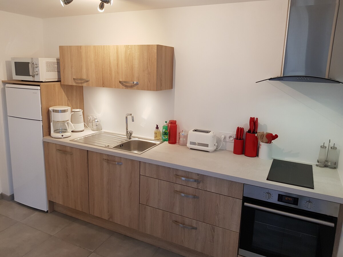 Appréciez le calme de cette pièce indépendante de 18m2 dans ma belle maison en pierre . Elle est décorée dans un esprit atelier cosy. ✓ Entrée indépendante ✓ Terrasse ✓ Forêt à proximité ✓ Lit "Queen Size" fait à l'arrivée ✓ Salle d'eau privative avec WC suspendu ✓ Serviettes de toilettes fournies ✓ Wifi ✓ Télévision ✓ Bouilloire avec sachets de thé et café soluble ✓ Mini Frigo ✓ Place de parking N'oubliez pas vos chaussons ;)