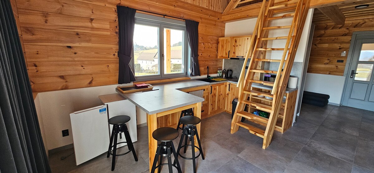 We built our mini house Pod Ořechy to maintain the maximum possible level of privacy and tranquility. It stands right next to a sheep enclosure and has a wonderful view of the forests and meadows. The cottage is small, but thoughtfully designed. It is located on a fenced property so that your four-legged pets can come with you. On the property you will also find a private Finnish wood-burning sauna with a romantic view, which you can use without restrictions. Inside you will find a comfortable bed, a full bathroom and a kitchenette.