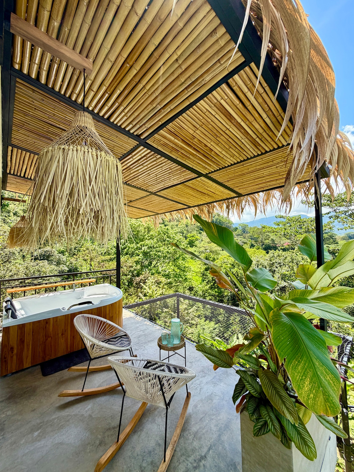 Elevated cabin constructed entirely from wood with excellent design, designed for a couple. It boasts a spectacular view towards the central mountain range and the forest, a very comfortable bathroom, a spacious deck for sunbathing, a hammock for lounging like a catamaran, and an outdoor Jacuzzi. The bed and linens are of top quality. The retreat includes sitting areas, excellent breakfast, and a dining area for other meals.