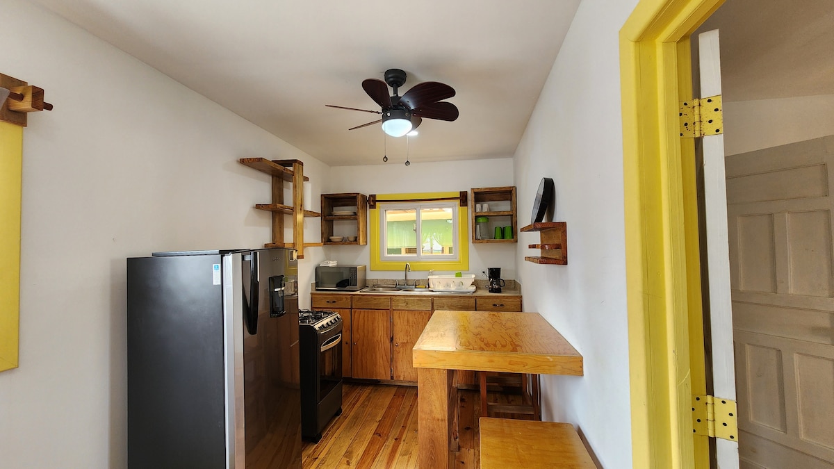 Acogedor departamento de madera, céntrico en Utila. Tiene A/C y ventiladores, cama cómoda, TV y cocina práctica con refrigeradora, estufa, microondas y cafetera. Luminoso y tranquilo: ideal para descansar después de explorar la isla. Corredor exterior con brisa caribeña. Perfecto para quienes buscan comodidad sencilla y buena ubicación.