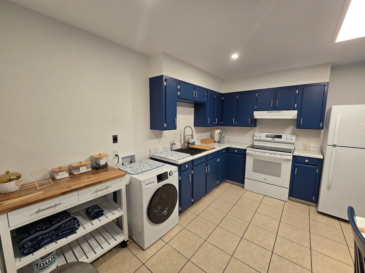 Welcome! Step inside this newly remodeled home, pull a shot of espresso and relax. This home has strong Wi-Fi, but no television. For the chef- This kitchen is fully stocked with table service, kettles, baking pans, blender, mixer, electric griddle and much more. Each of the three bedrooms has a queen-sized bed. Completing the house are two full bathrooms and hiding behind a sliding barn door you will find a laundry complete with washer, dryer, iron and ironing board.