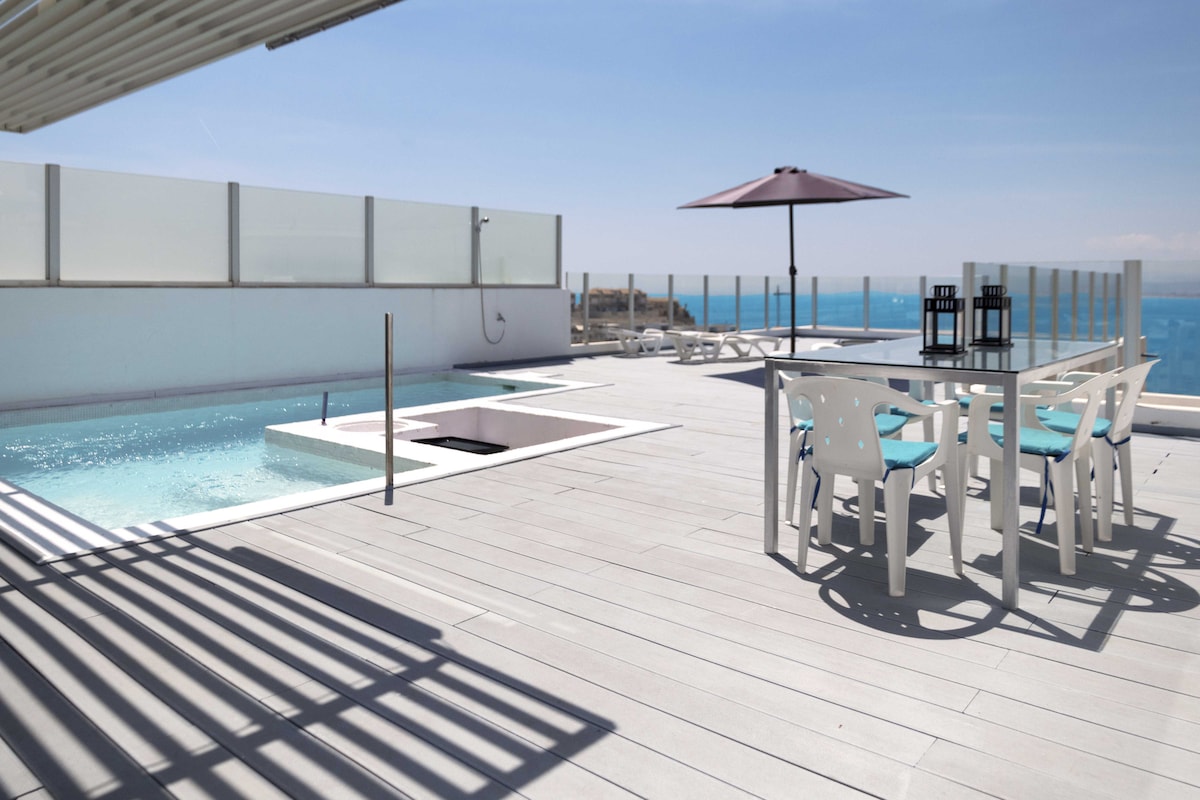Casa con PISCINA exclusiva para FAMILIAS y grupos respetuosos, no se alquila para fiestas. Situada en PRIMERA LINEA, desde los balcones puedes observar el mar. Destaca por su amplitud y comodidad, donde se pueden alojar hasta 10-12 PERSONAS dependiendo de los huéspedes. Totalmente equipada, con terrazas y una PISCINA PRIVADA de 30m2, con seguridad para los niños. Conectada con el CENTRO de la ciudad y al lado de SUPERMERCADOS. También dispone de Parking y ascensor para minusválidos.