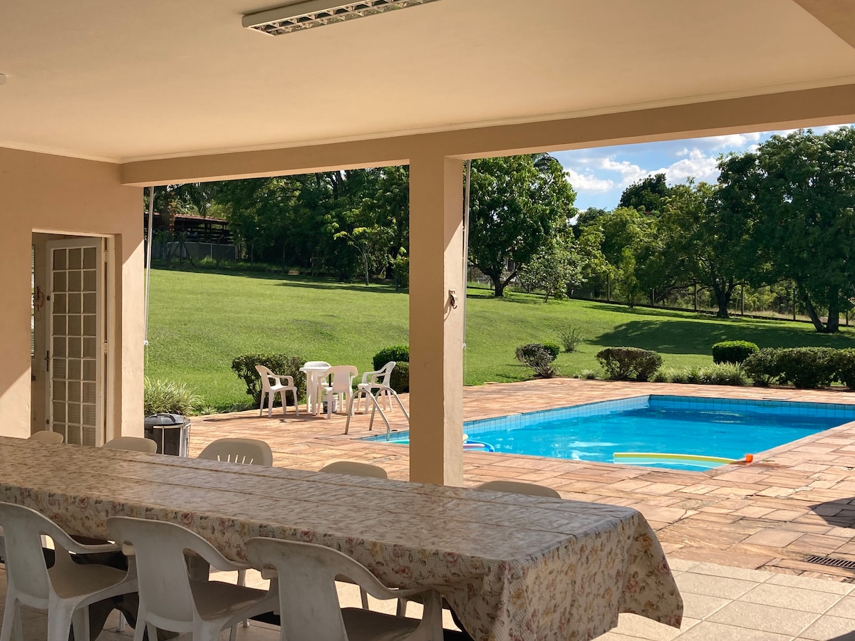 Relaxe neste espaço calmo e cheio de estilo. Terreno totalmente cercado, ideal para deixar seus pets livres. Sempre bom lembrar que vc estará num ambiente semi rural onde as comodidades da cidade podem sofrer alterações como falta de energia/internet, não é comum mas podem oscilar. Há muitos pássaros,saguis,frutas,horta natural. Muita área livre e piscina estruturada, 7mil lts. Espaços para conversar, redes e churrasco, fogueira . A casa é simples e cheia de charme informal.