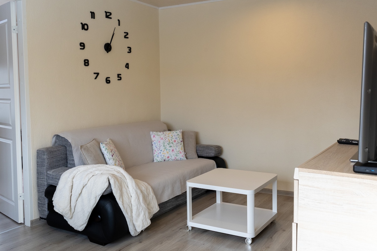 Cozy 34sq/m 5th floor apartment with a beautiful sunset view. Suitable for 1 or 2 guests. Close to several shops, bus stop, and a 10 minute walk away from the city center. Equipped with a fully functional kitchen and bathroom. Living room/bedroom has a pull-out sofa that fits 2 people. There is also free wifi, a TV, desk and iron. Free parking in front of the building or by the nearby shop.