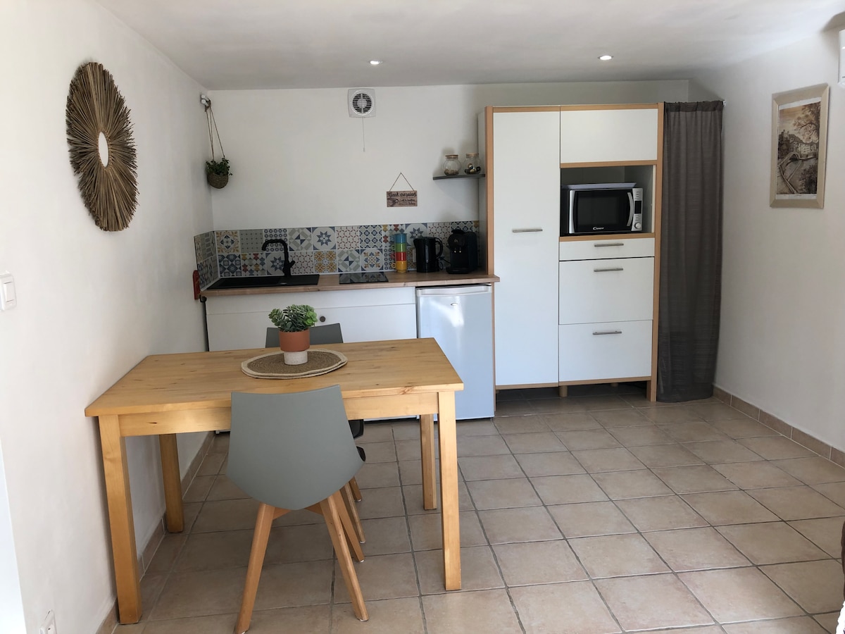 Welcome to our private oasis for 1 or 2 people in the heart of la roquette! Enjoy the heated salt water pool surrounded by tropical plants. The space will offer you a haven of shade and tranquility. Have breakfast, an aperitif, or cook poolside in the outdoor patio kitchen. The bedroom is air conditioned and equipped with luxury hotel quality bedding and organic linens, to ensure that your stay is relaxing and memorable.
