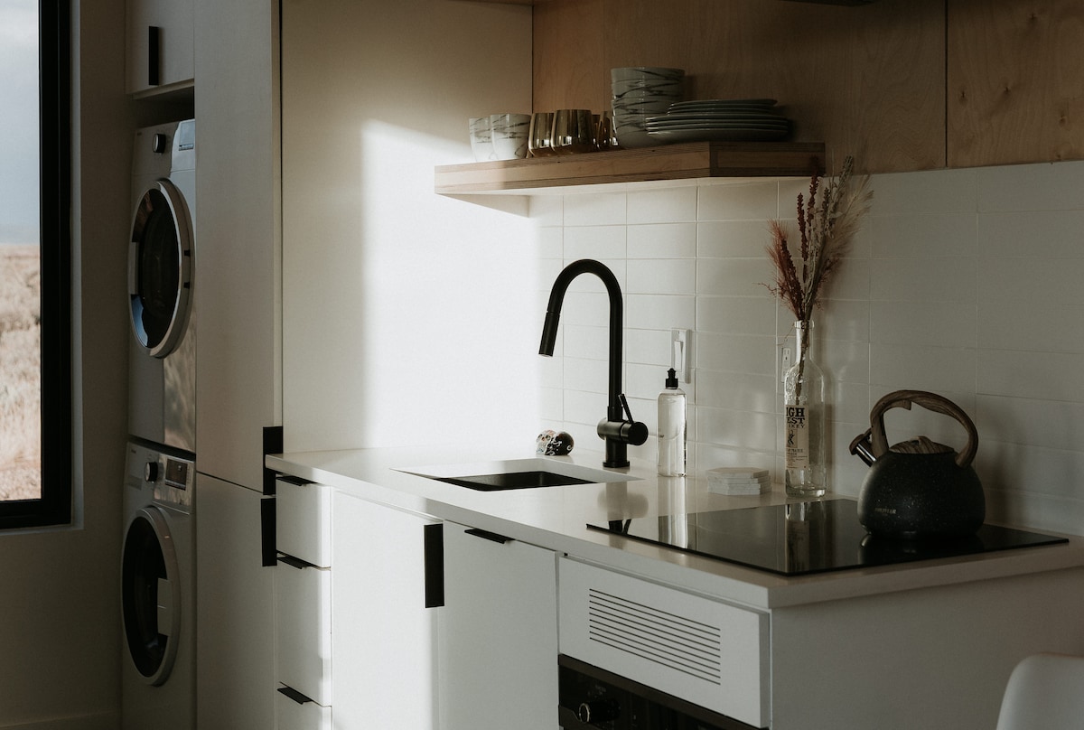 Set on 30 acres of private land on the western edge of town, Taos Skybox "Horizons" studio is a unique vacation home experience, purpose-built to take advantage of the dark skies and endless vistas of the high desert landscape. Sitting at 7,000 ft. above sea level, views abound, as your retreat borders Taos Pueblo Native lands, yet is only 15 minutes from the Taos Plaza. Truly a memorable destination, Horizons is modern and well-equipped with a full kitchen, laundry, and fiber optic internet!