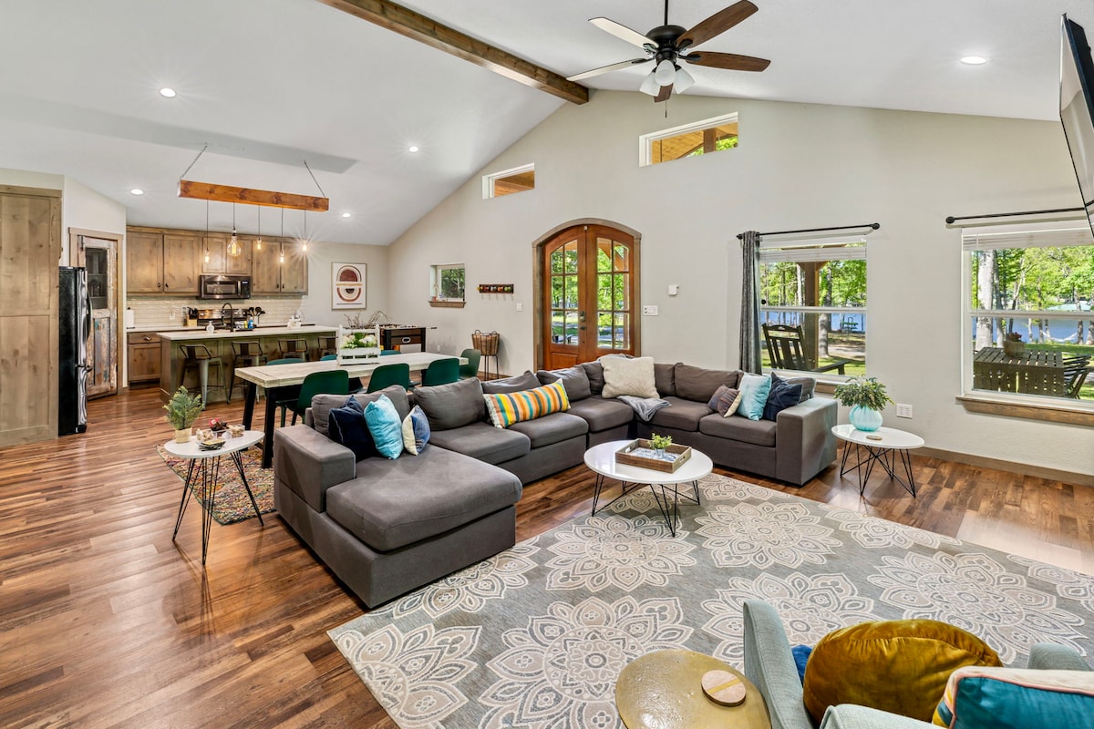 Exquisite 4 bed 2 bath home on 2+acres of scenic Lake Holbrook w/ 210’ of shoreline. Huge Front Porch w/ rocking chairs, fans, lights, dining table. Sleeps 14 w/open concept living w/ gas fireplace & modern kitchen w/ black stainless appliances & reclaimed glass counters. Board games, PPong,Hammocks, kayaks, paddlboards,canoe, fire pit, fishing pier all available for your stay. Sand Beach entry & great fishing . Hammocks in the shade, basketball goal & brand new covered pier with fishing dock!