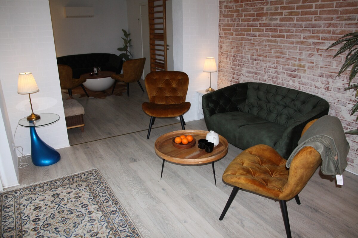 The home is a former stable that has been made really cozy with a kitchen, living room and bathroom and upstairs is a large living room with two beds and a sofa bed. There is parking right at the private entrance, where there is a terrace facing east. We have a local grocery store 500 meters away. There is the possibility to get to the city by train.