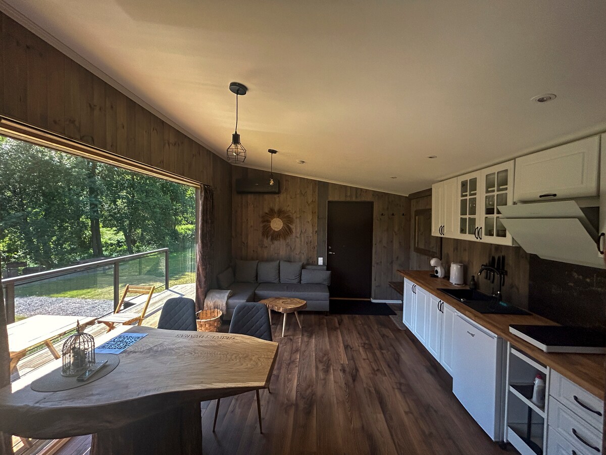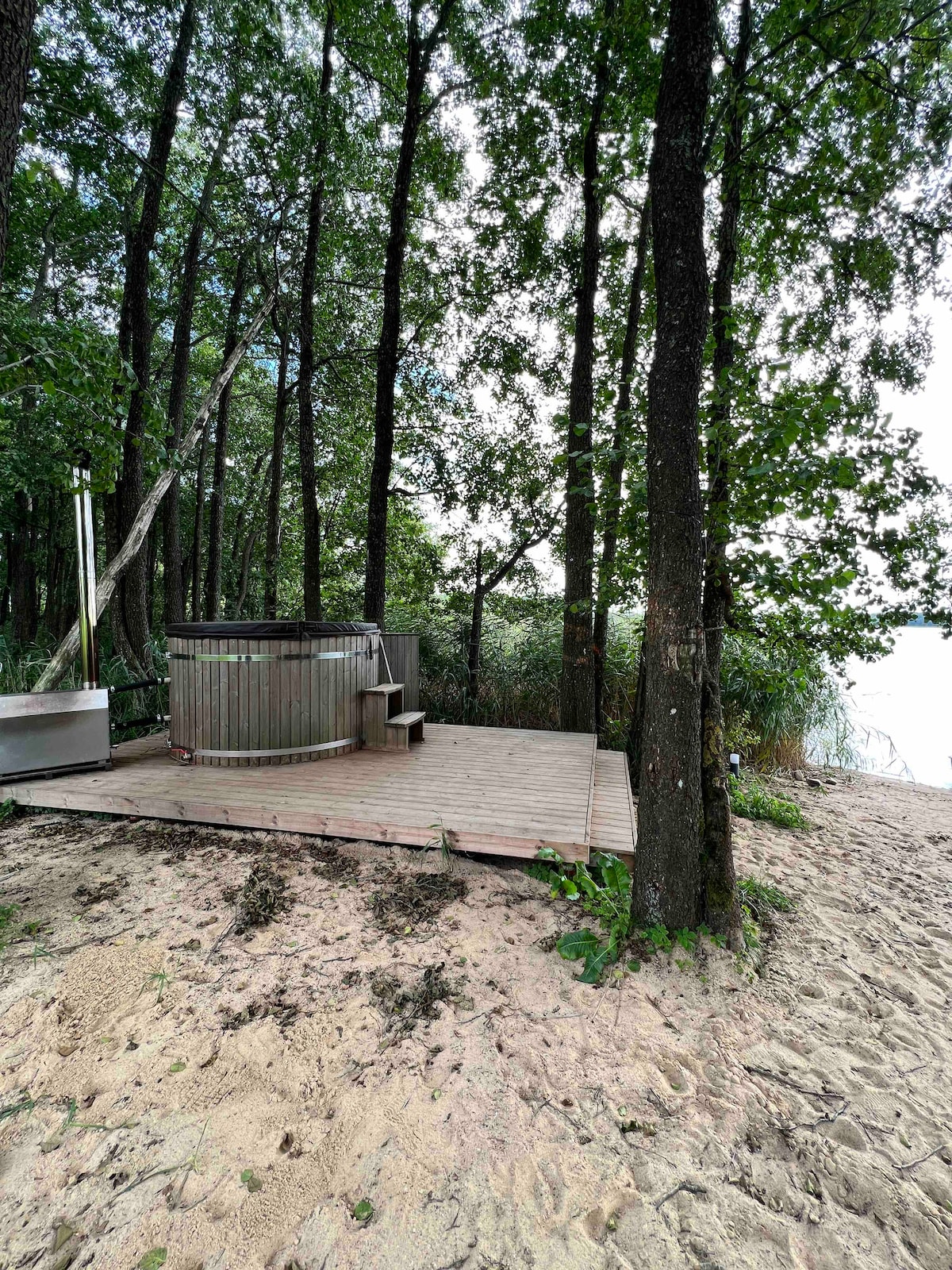 Juoda Truoba - 3 lakeside cabins - offers a unique escape with a free hot tub, modern sauna (extra charge), and a home cinema, set by a serene lake with a sandy beach, wooden boat, and stand-up paddles for relaxing adventures combining comfort, nature, and quiet luxury in one unforgettable stay.