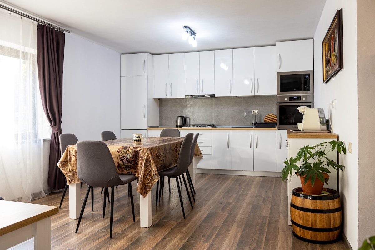 This elegant accommodation is perfect for relaxation, offering a generous living room with kitchen on the ground floor and upstairs 2 rooms with double bed. Free wi-fi climate underfloor heating 24/7 hot water Large screen Android TV parking in the yard access to the spa for a fee - swimming pool, jacuzzi and sauna we provide breakfast, lunch and dinner.