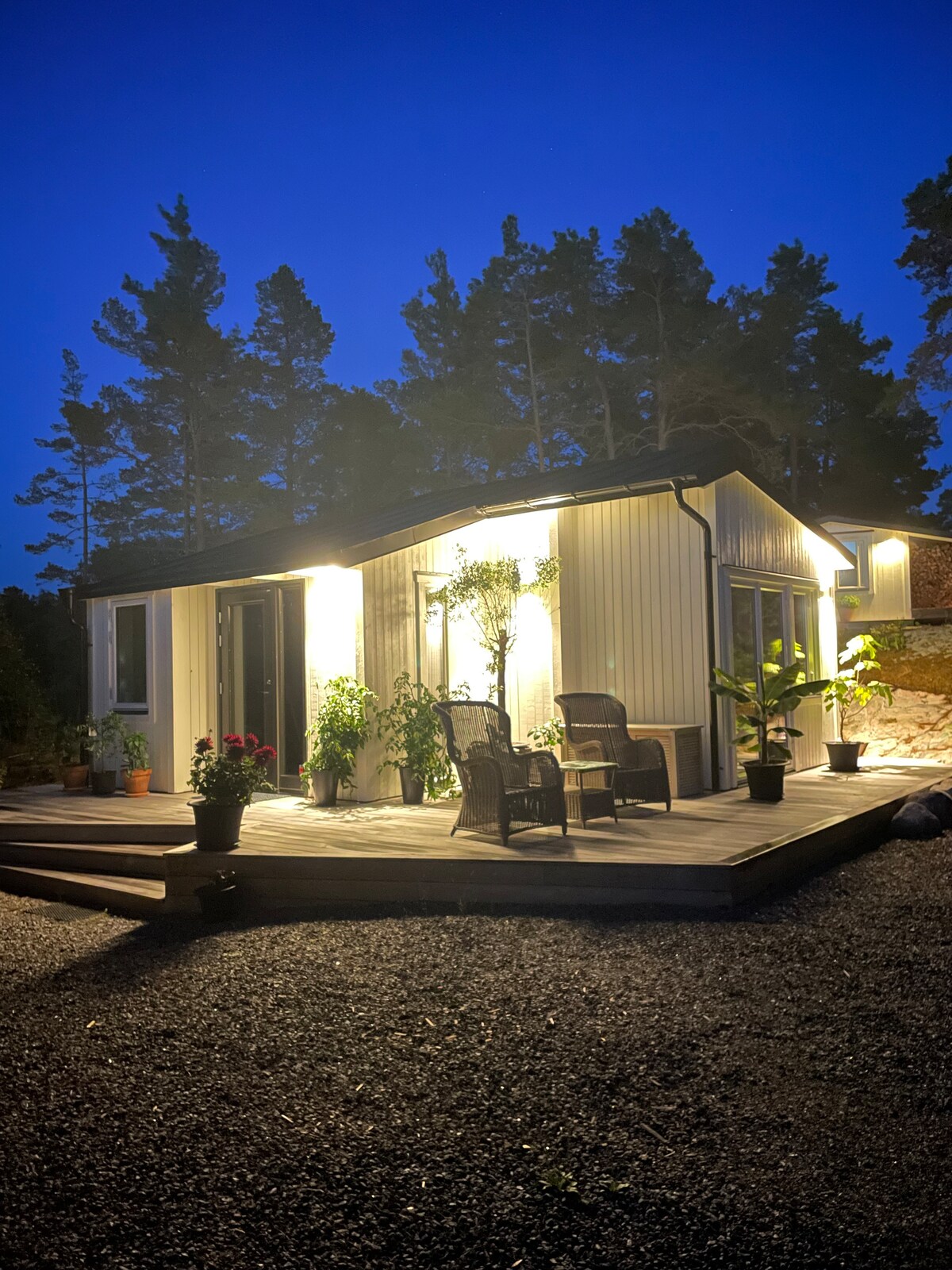 Located between Stockholm city and its beautiful archipelago. Right by the sea. Close to local shops and restaurants. Cottage built 2016. Comfy King size doublebed, two beds on a cozy loft. Wifi. De luxe bathroom w shower, WC, zink and Heated floor. Large flat screen cable-TV. Fridge, Water boiler, Coffee Press, Cutlery, Glasses, Mugs etc. Please note: NO FULL Kitchen.. but a Chef Plus Microw/oven. Also, in season, an outdoor grill, seating chairs & a table.