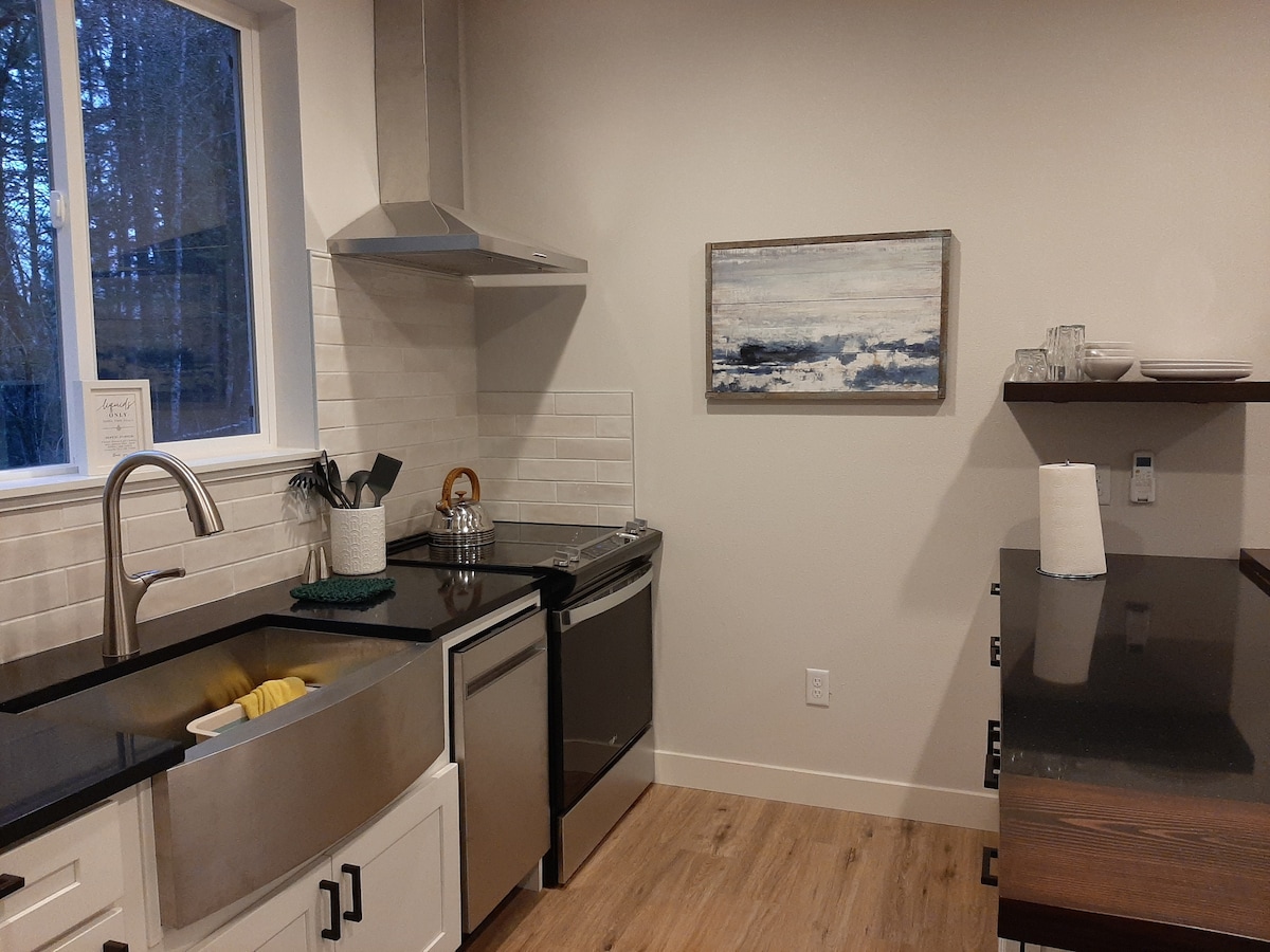 Unwind from the hurly burly in this bright, cozy cottage. You'll find a spacious, full kitchen, living room area, and Queen bed. Enjoy coffee in a sitting area behind the cottage, or spend a relaxing evening there by the fire. Walk to trails, tennis courts, coffee roastery, and Vashon Center for the Arts. A mile and a half from the shops and restaurants of Vashon town. There's a pullout couch in the living room area. Full bath. 650 sq. ft.