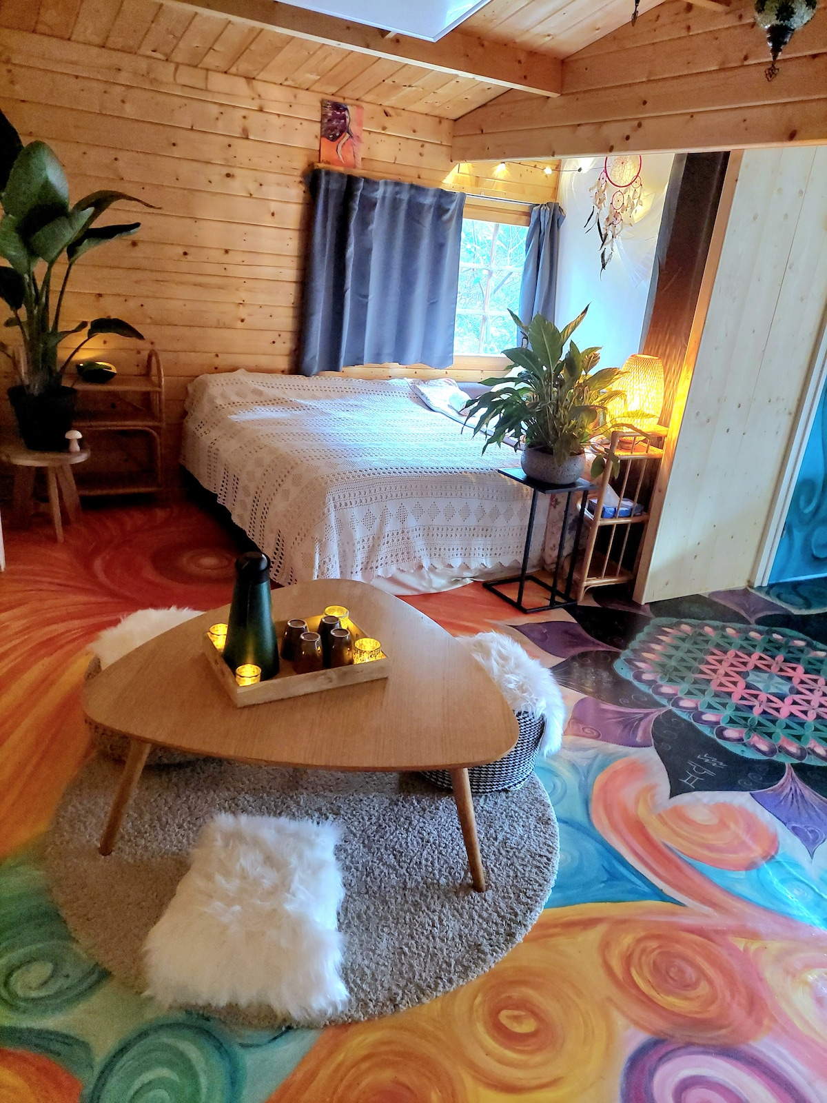 Relax in this Cosy Cabin (3x3m) in a quiet and green garden in Veldhoven Dorp. Ideal for solo travelers or couples in love, looking for a special experience. Several bars/restaurants/shops at 5 min walk. Bus to Eindhoven: 20 min, taxi to Airport: 15 min. Also nice area for walking/ cycling. The bed (140x200) is easy to change into a couch during daytime. Good wifi. Toilet, shower/bath and fridge with cold drinks in main house. If you like a (quiet) camping vibe, you'll love this place.